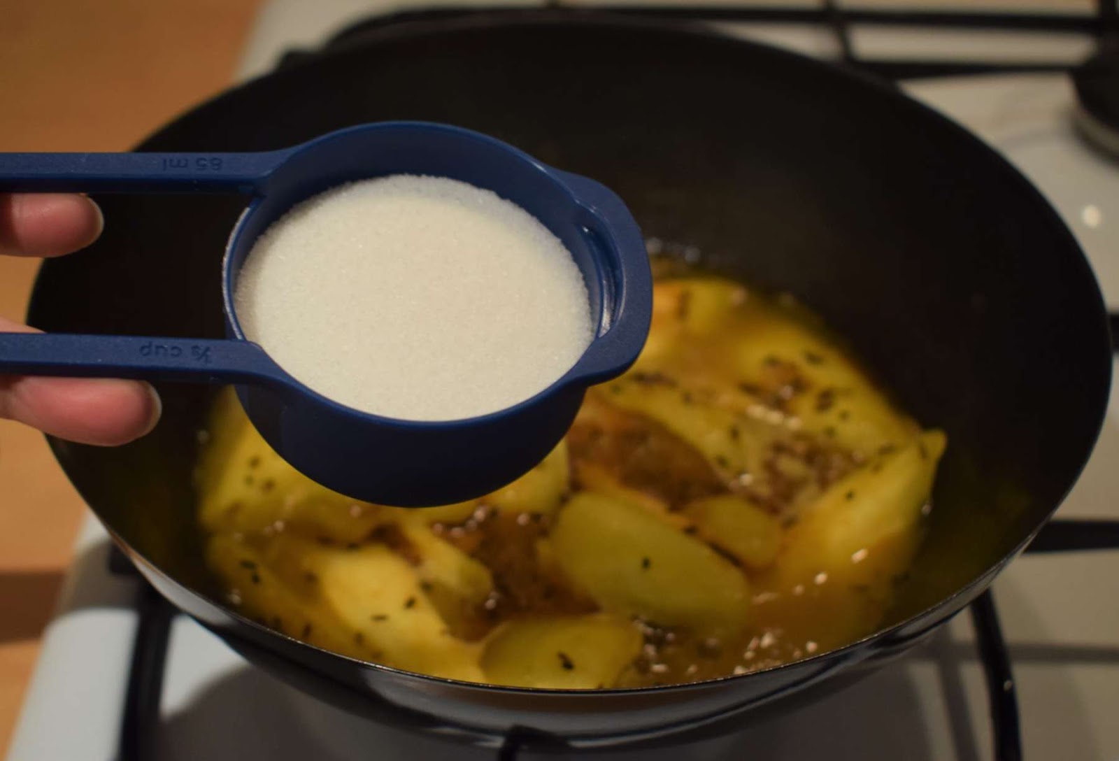 - Add sugar into the pan and mix it nicely.