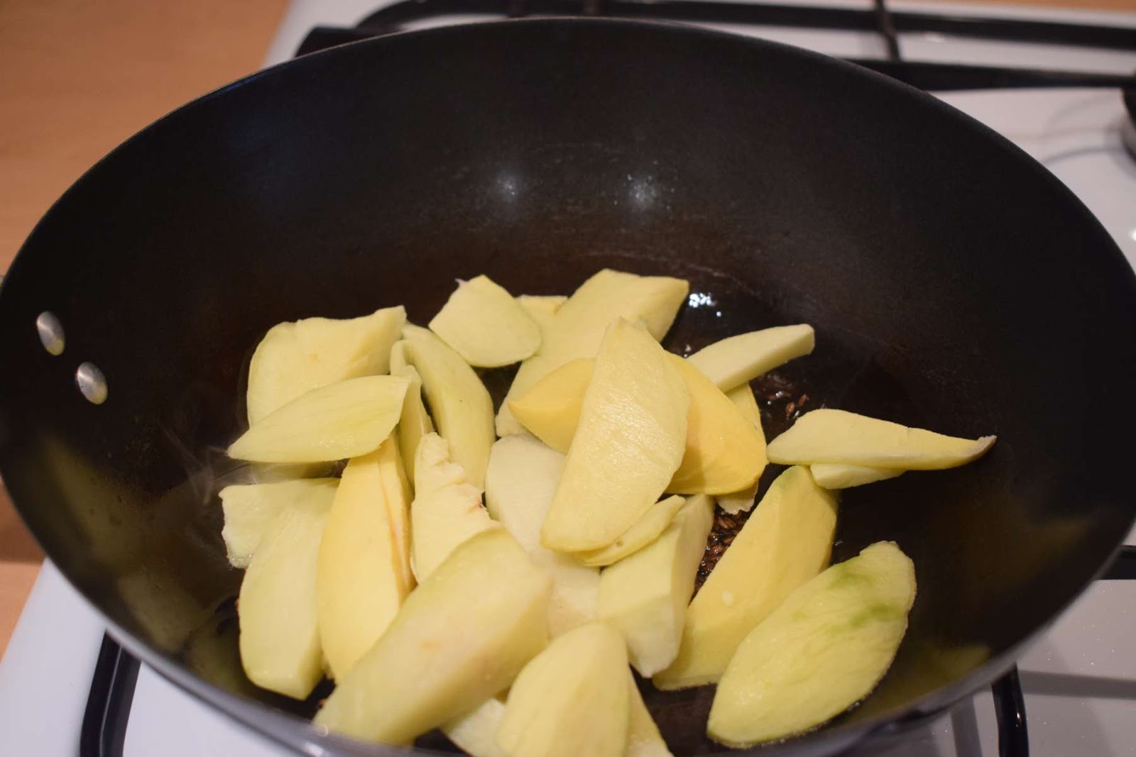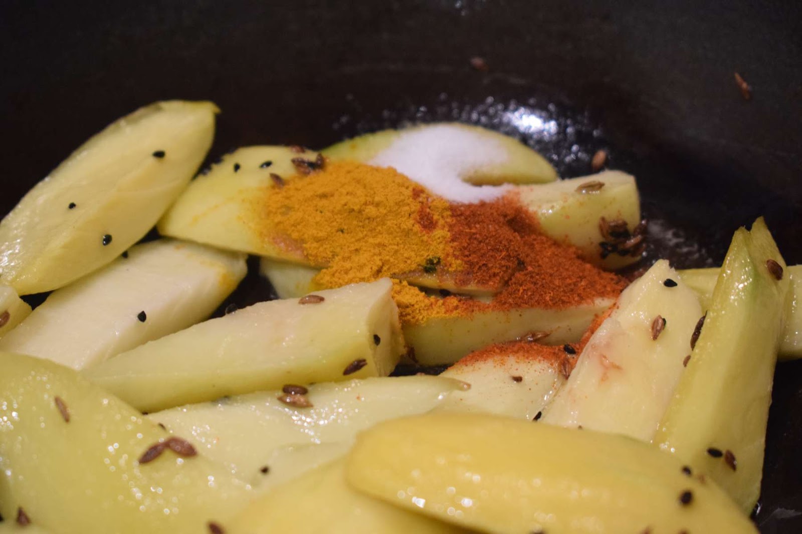 - Add the green mango pieces into the pan and give a nice mix.