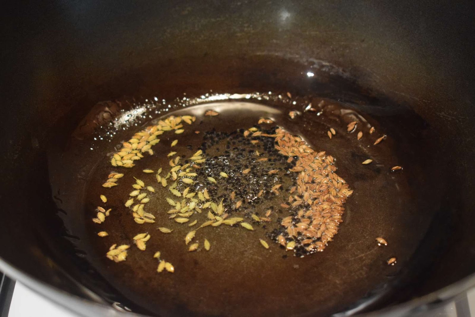 - Add cumin seeds, fennel seeds and nigella seeds into the pan and let them crackle.