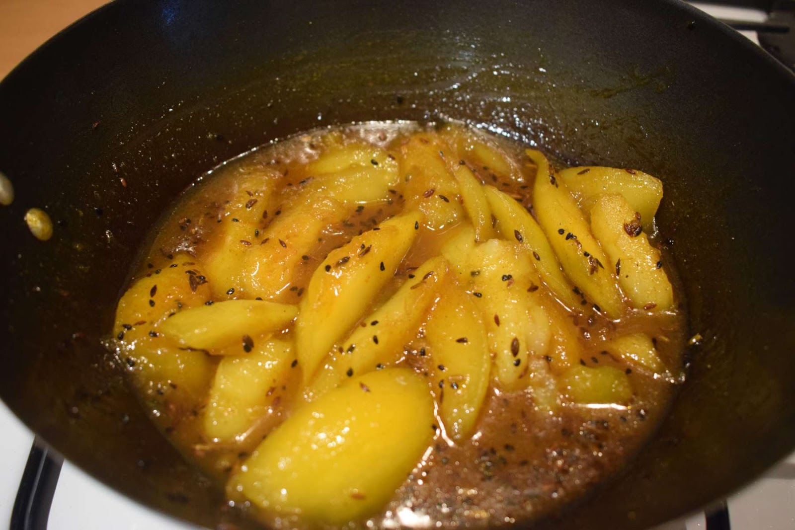 - Put the flame in low and cook it for 5-6 minutes with lid until the mangoes get tender.