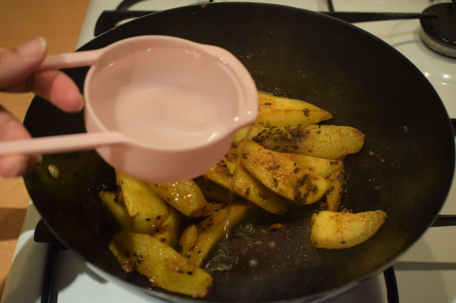 - Add ½ cup of water into the pan and give a nice stir.