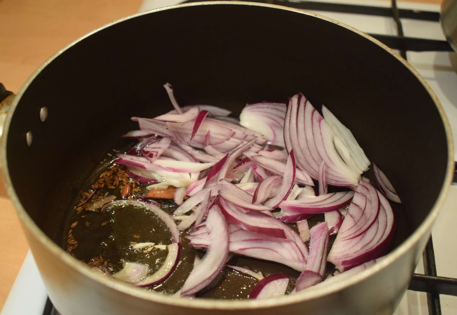 - Once the oil is hot, add Cumin seeds, Cinnamon stick, Cardamoms and Cloves and let them crackle.