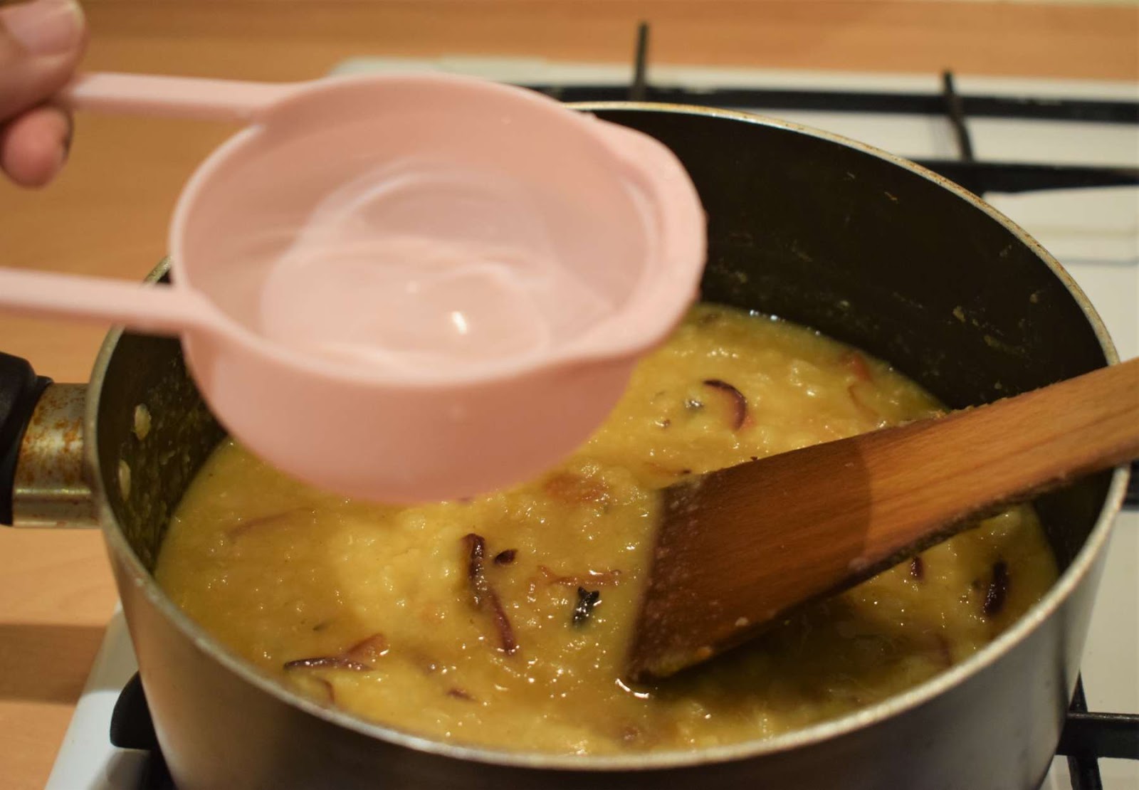 - Add the boiled dal (Step 7) into pan and mix it properly.