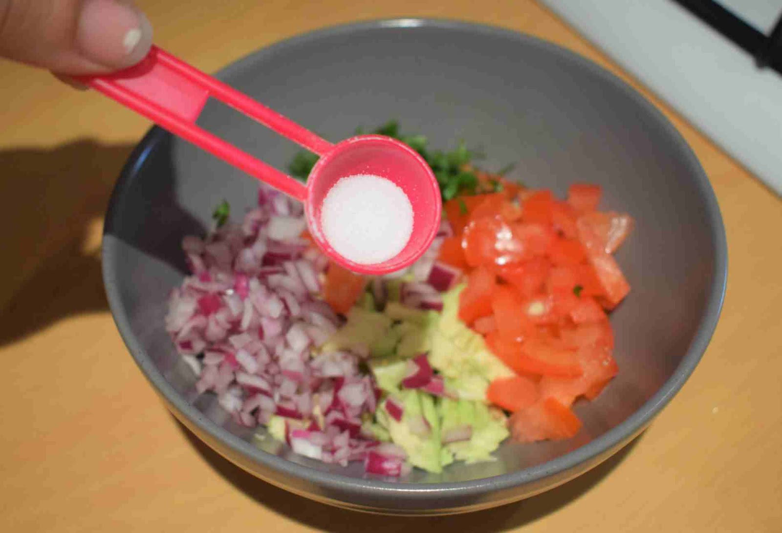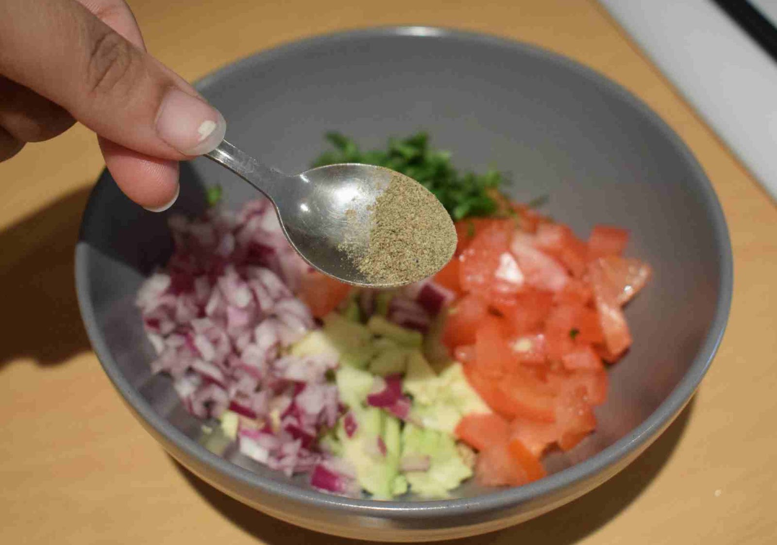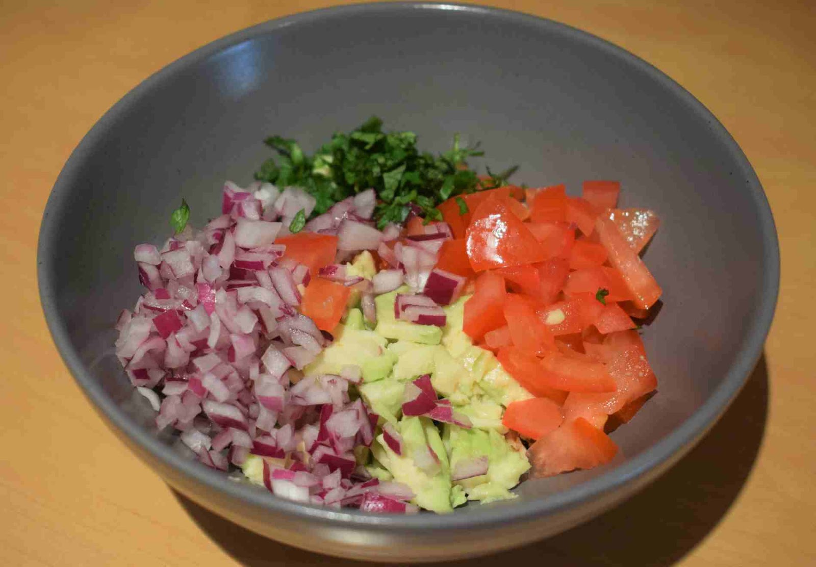 - Add the finely chopped Onion, Tomato and Basils into a mixing bowl.