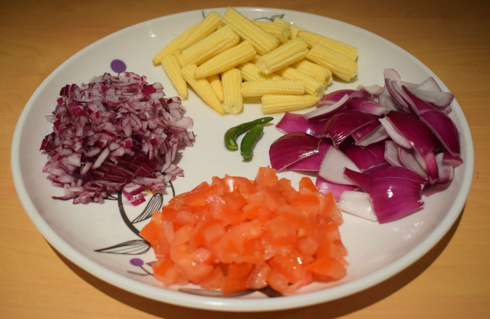 - Wash the Baby Corns and cut the larger ones into halves. Keep them aside.