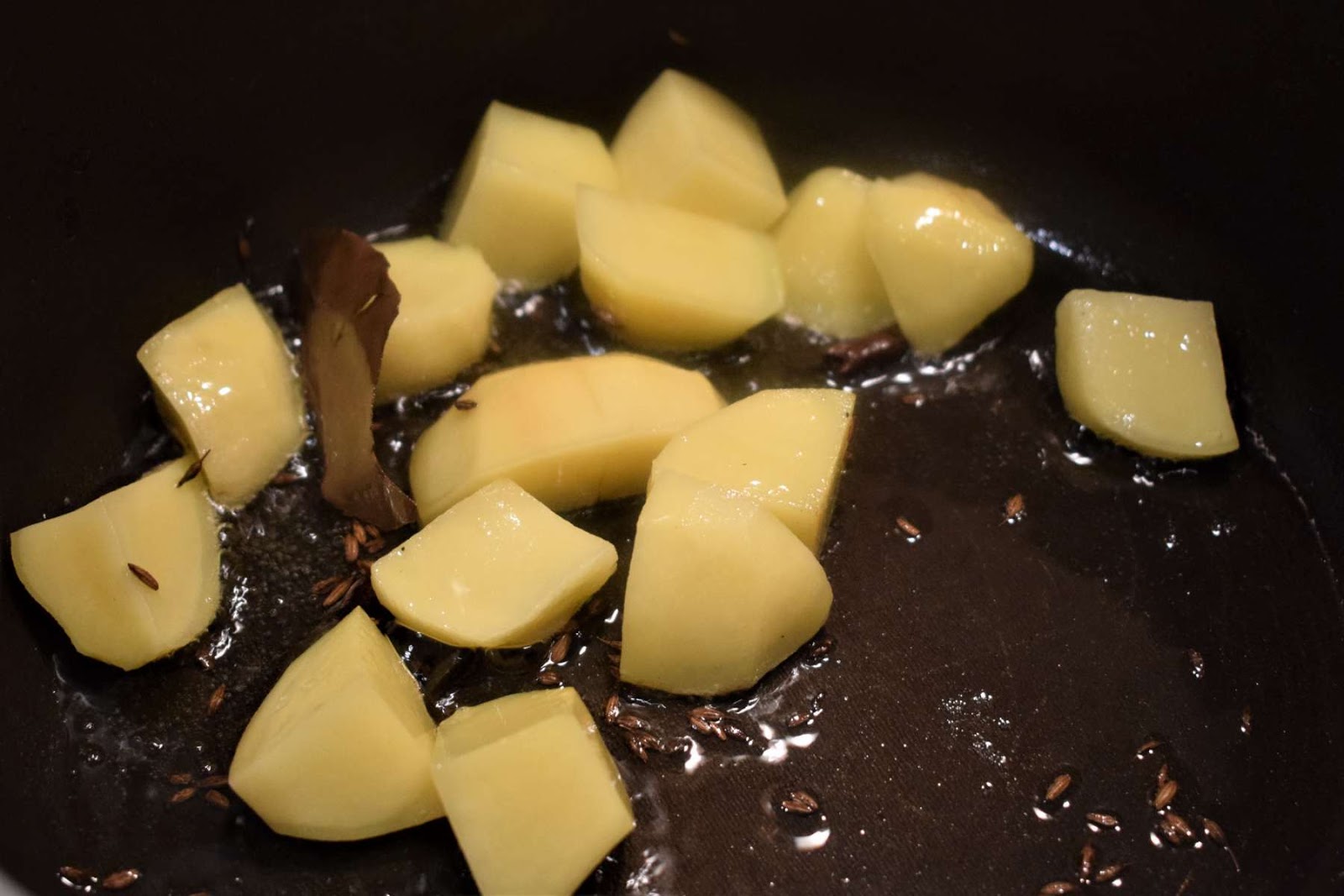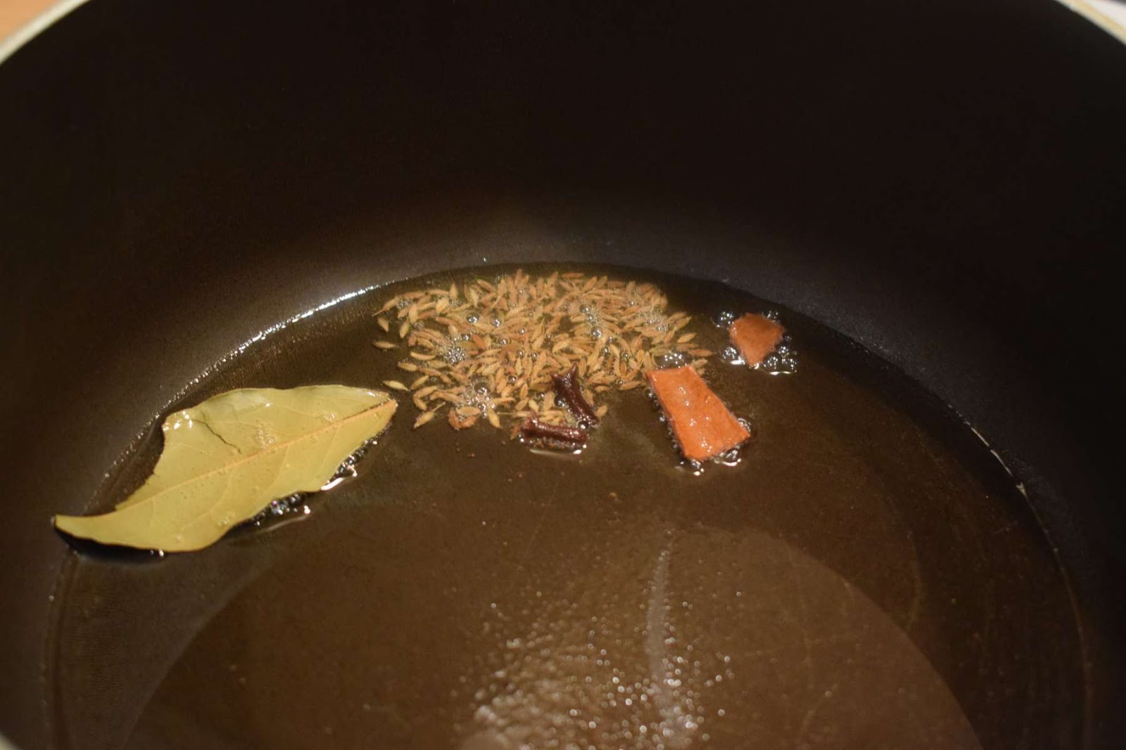 - Add Cumin seeds (Jeera), Bay leaf, Cloves, Cinnamon stick into the pan and let them crackle.