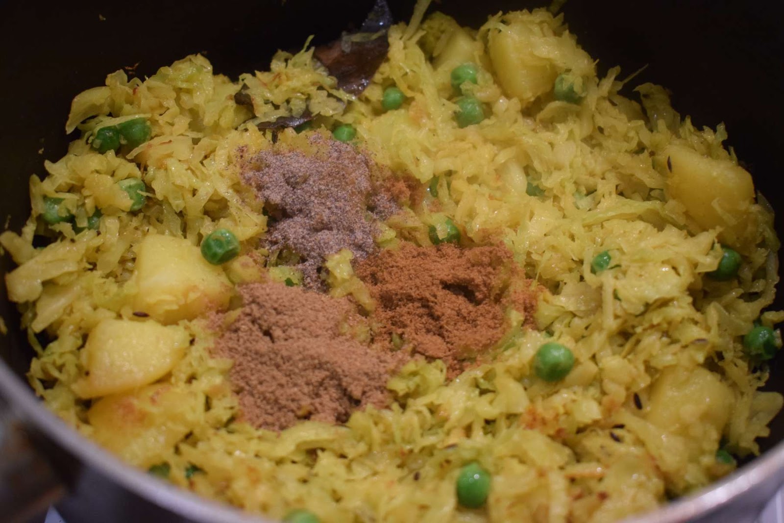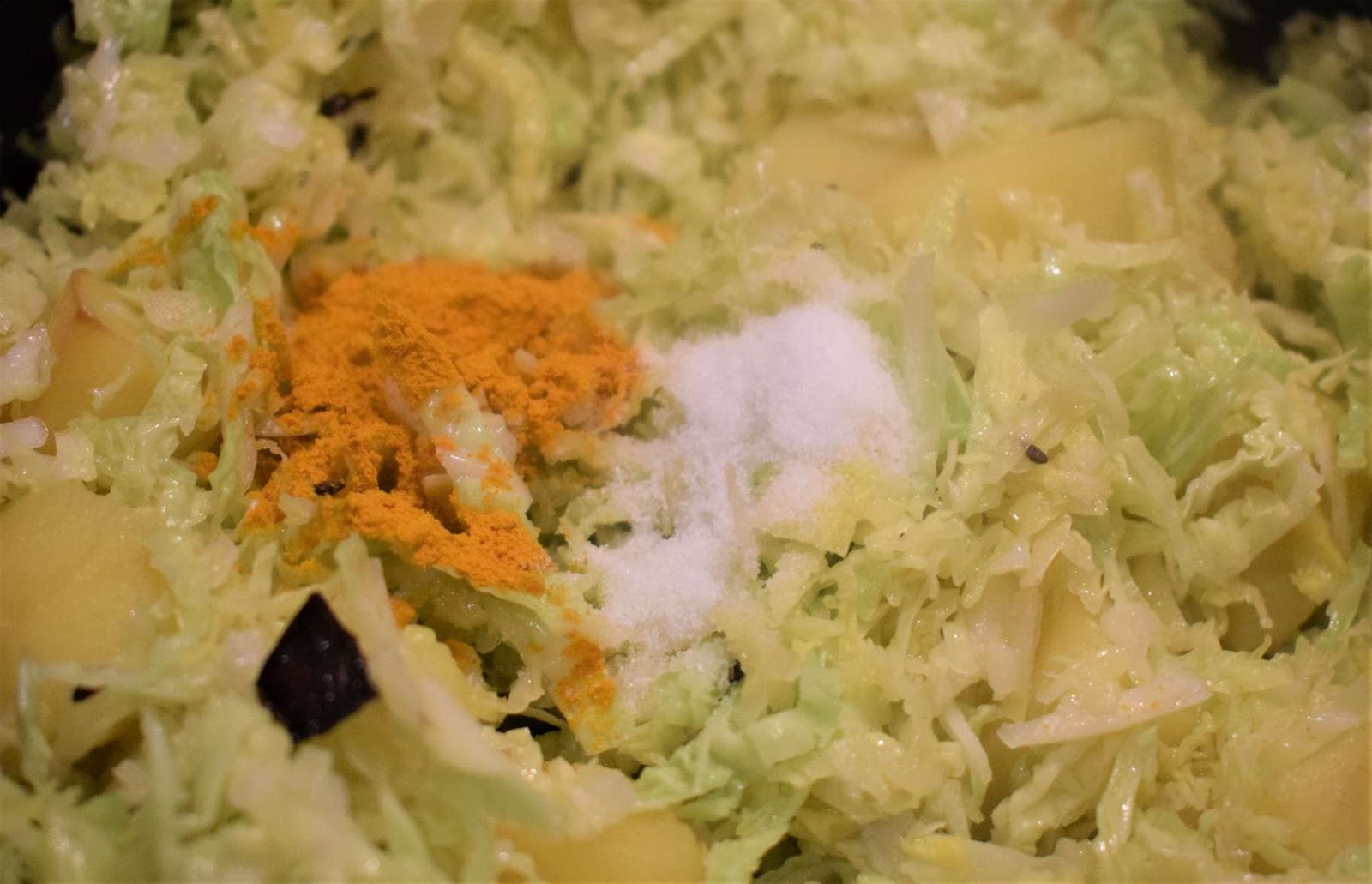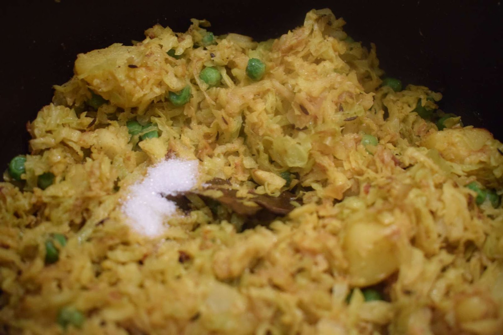 After tempering the whole spices, I have cooked the potato chunks for some time before adding the shredded cabbage. Then I have added the cabbage and cooked it with lid. I have not added any extra water to cook this dish. Only if your cabbage is too dry, you can add some extra water.