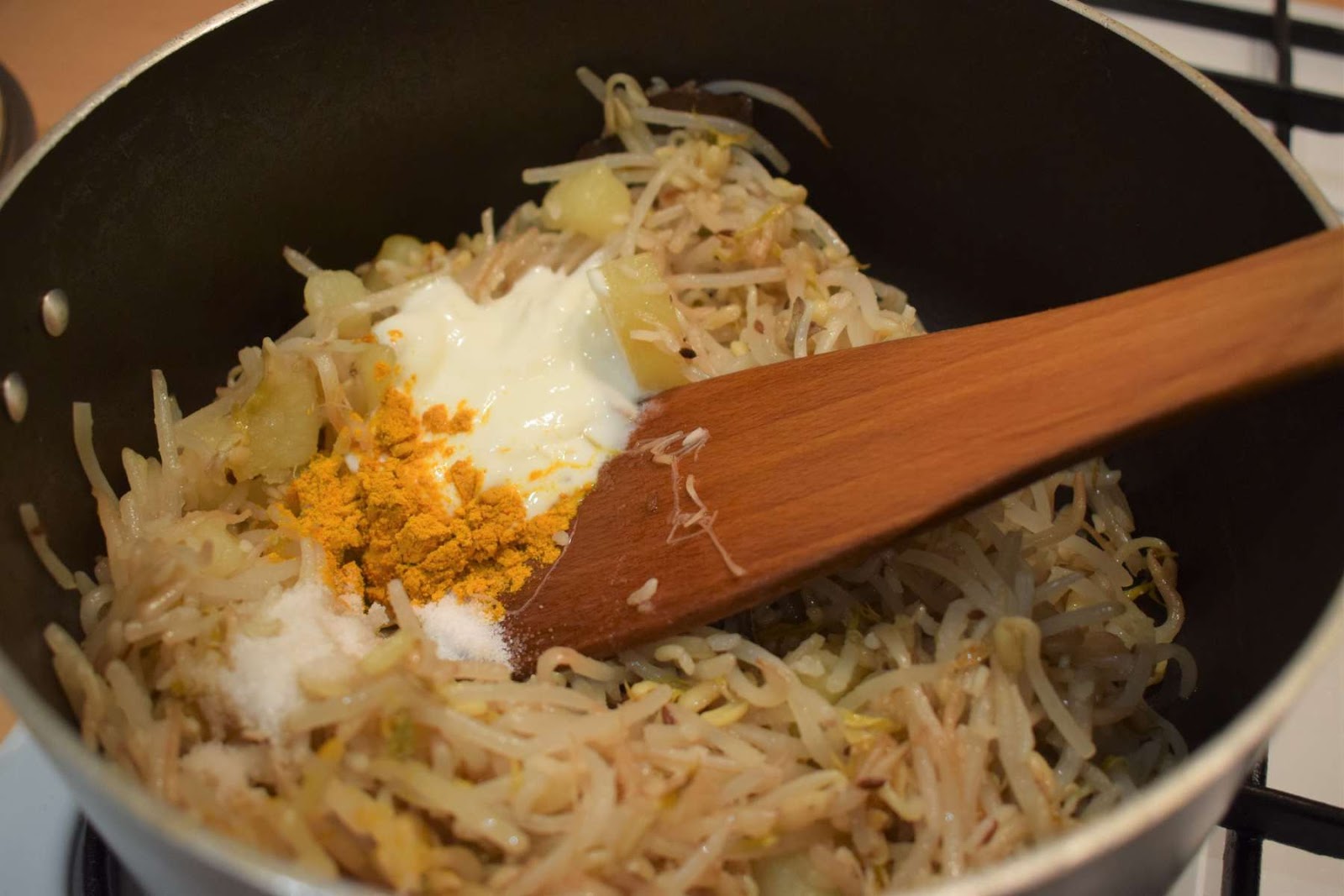 - When the volume of beansprout reduces to 3/4th, add Salt, Turmeric powder and Yogurt.