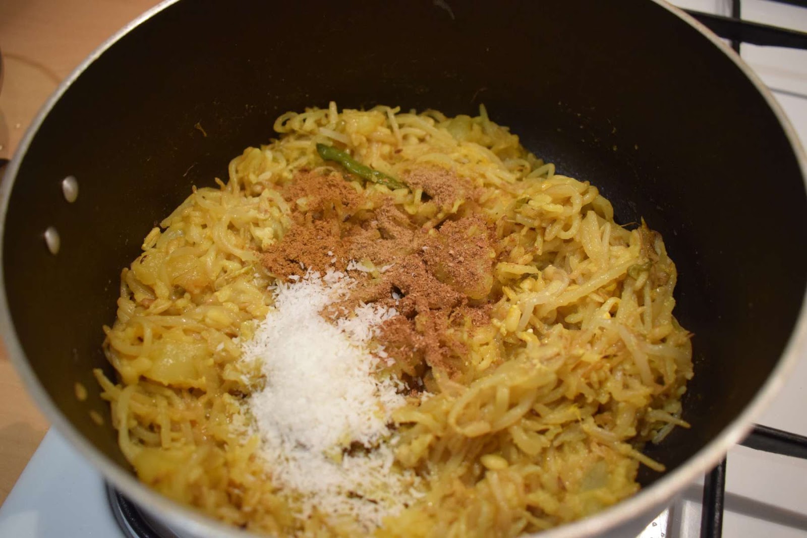 - Add Cumin powder, Coriander powder, desiccated Coconut and mix all the ingredients properly.