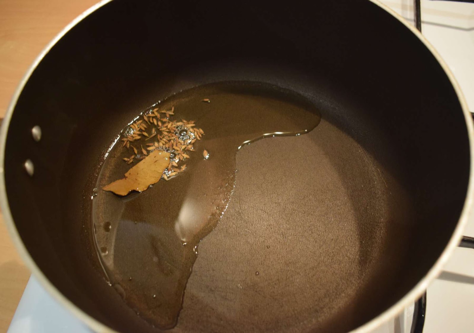 - Once the Oil is hot, add Cumin seeds, Bay leaves and let them crackle.