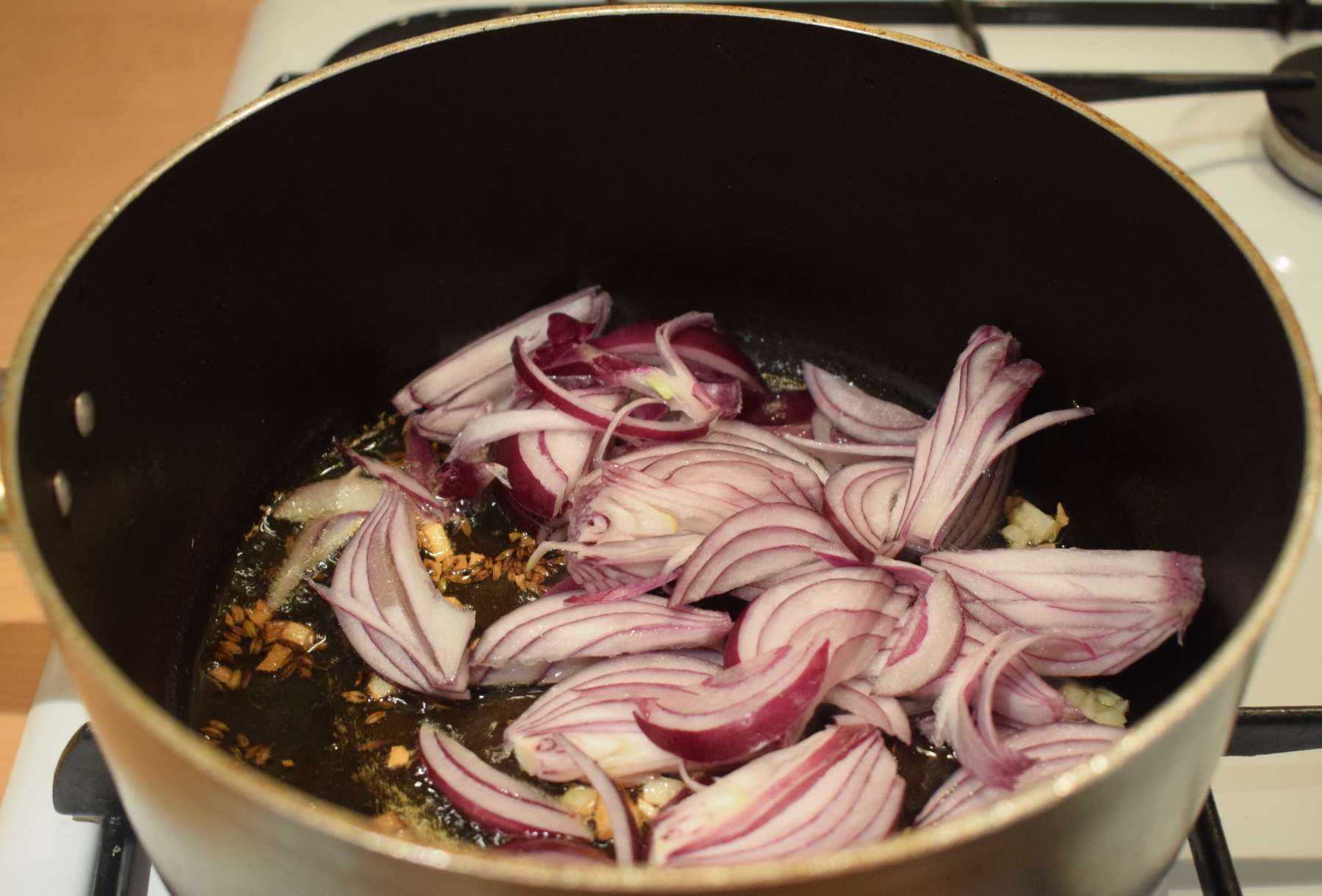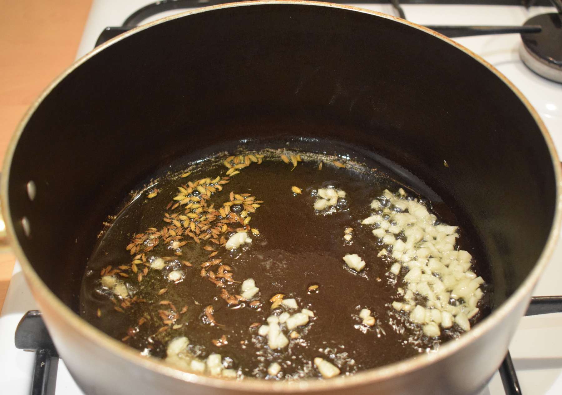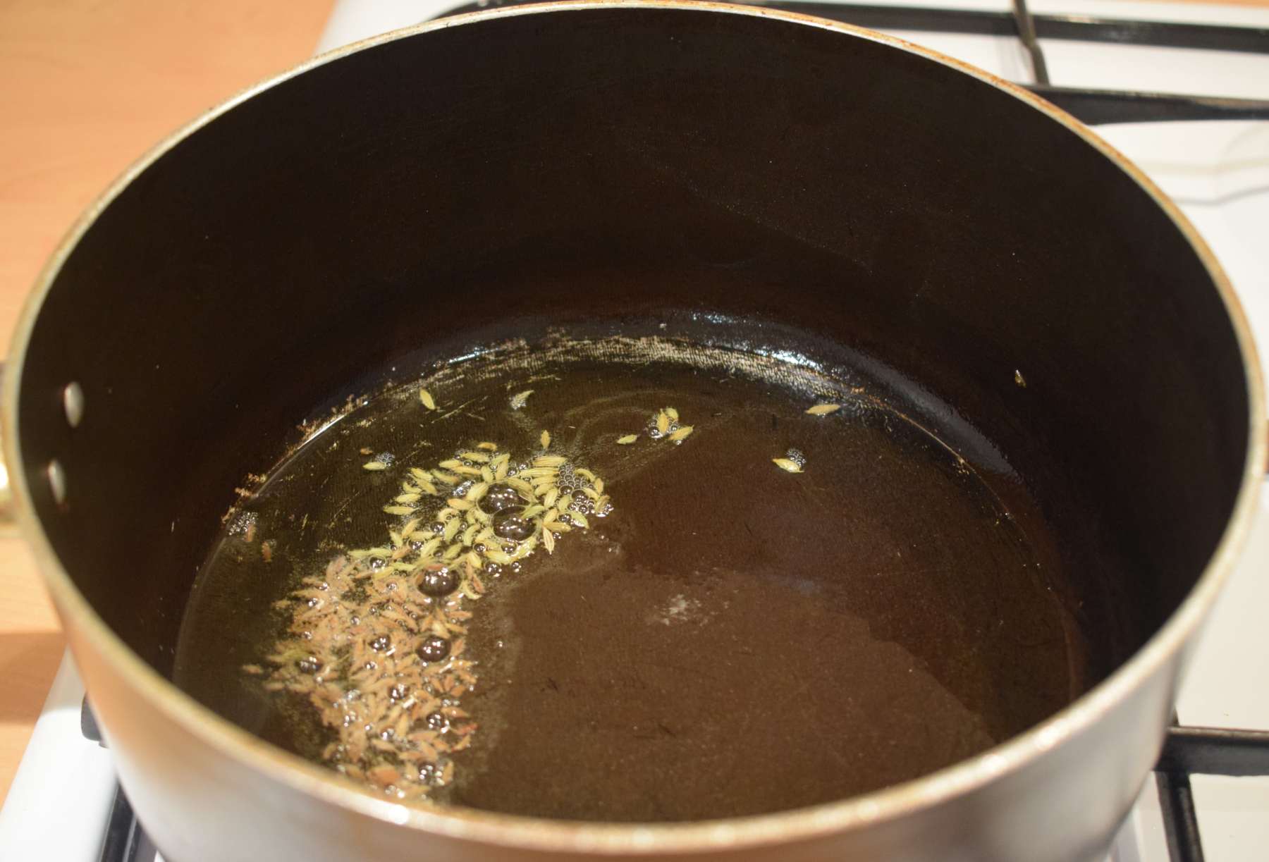 - Add cumin seeds, fennel seeds into the pan and let them crackle.