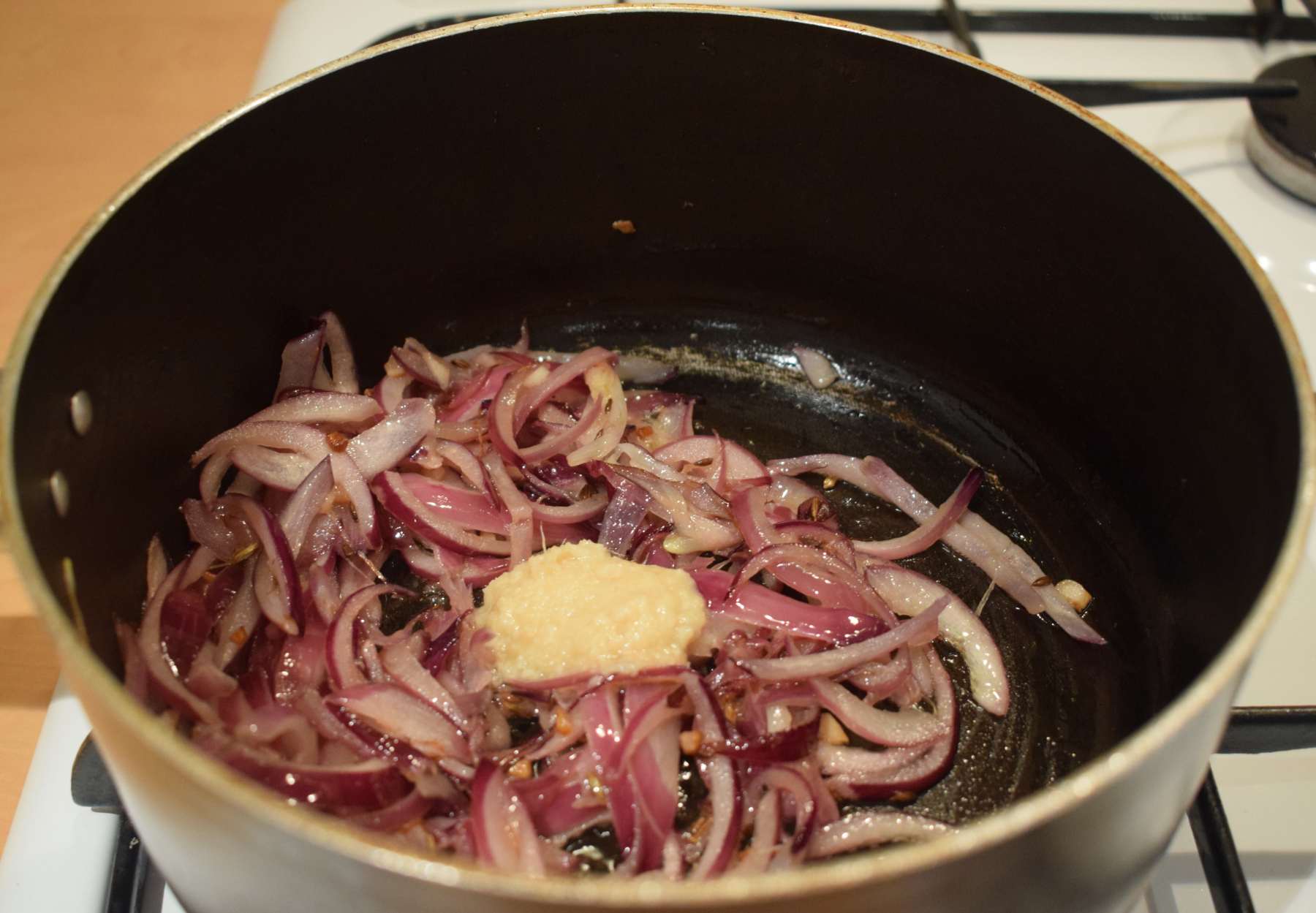 - Add ginger paste into the pan and give a nice mix. Cook it in medium flame for 1-2 minutes until the raw smell disappears.