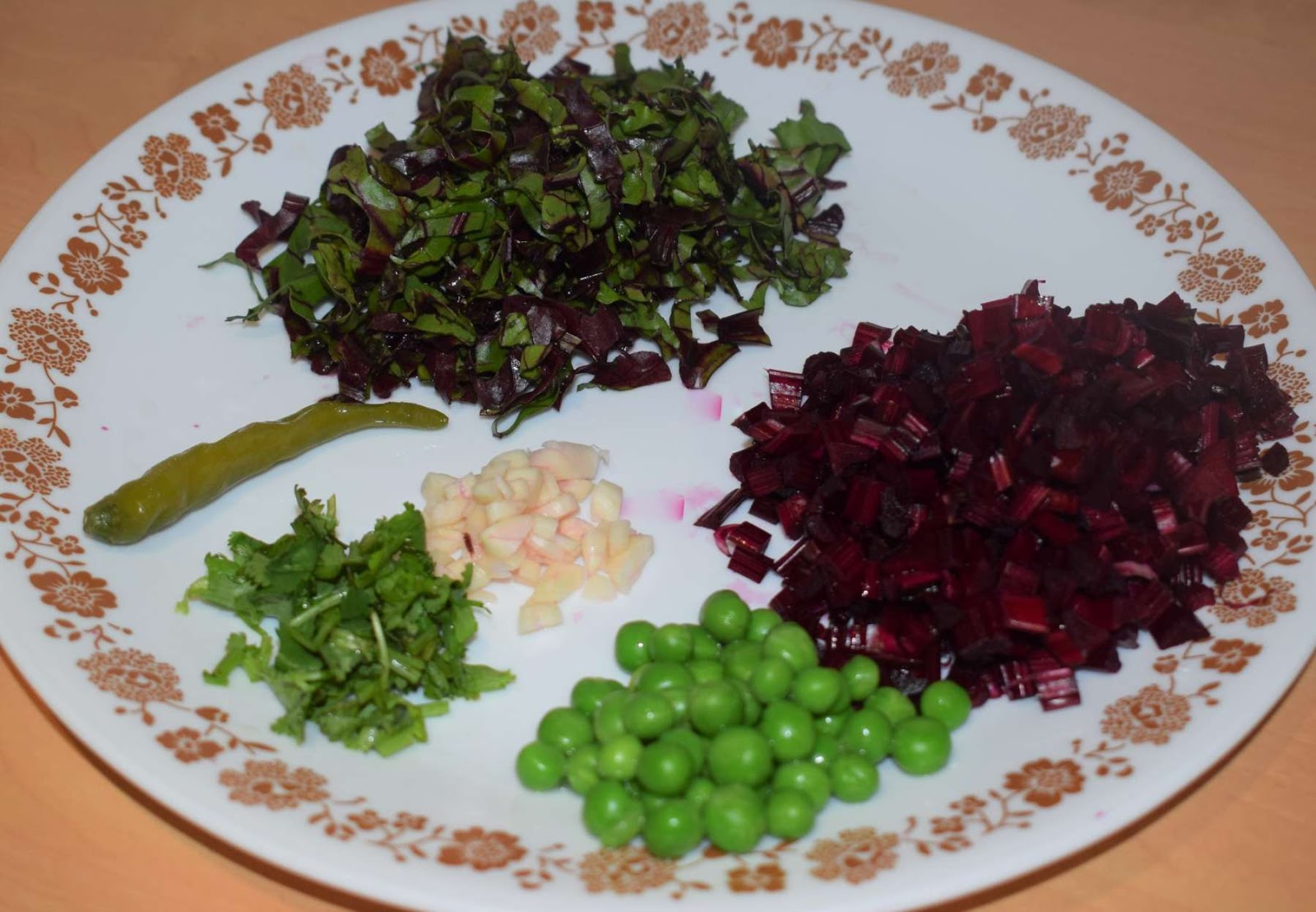 In this preparation, first I have washed and cleaned the stalks and leaves of Beetroots thoroughly. Always make sure that there is absolutely no soil stuck to the stalks and leaves because it can ruin the dish and all your efforts.