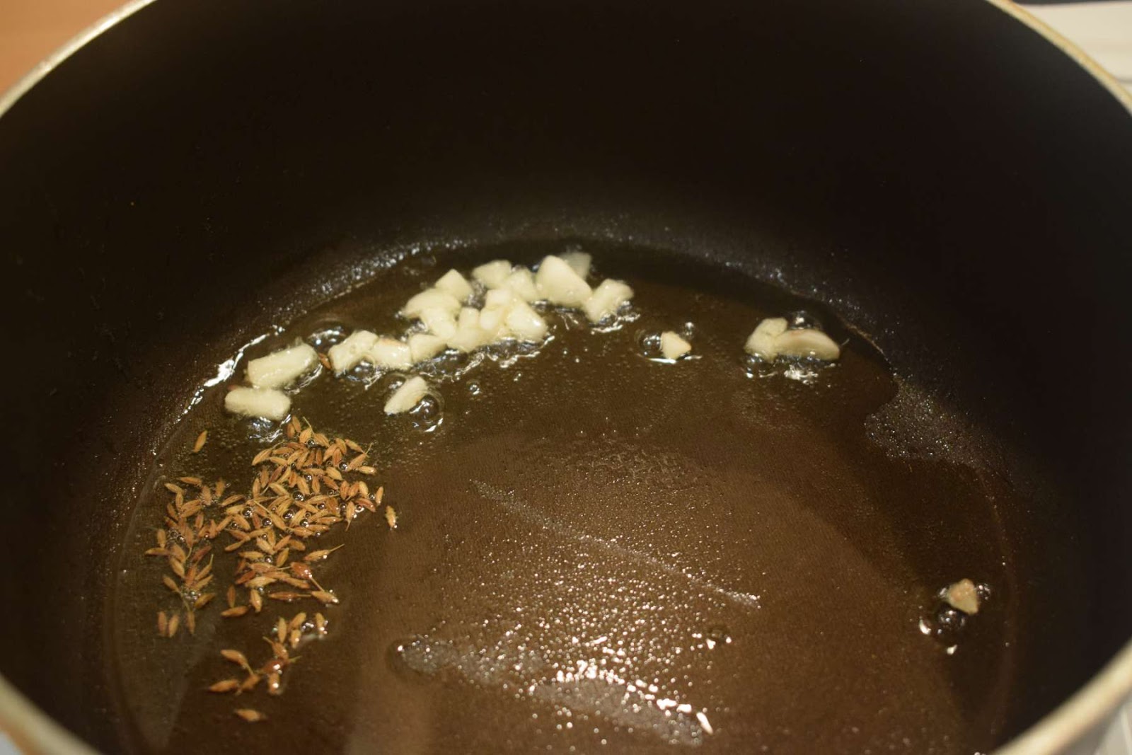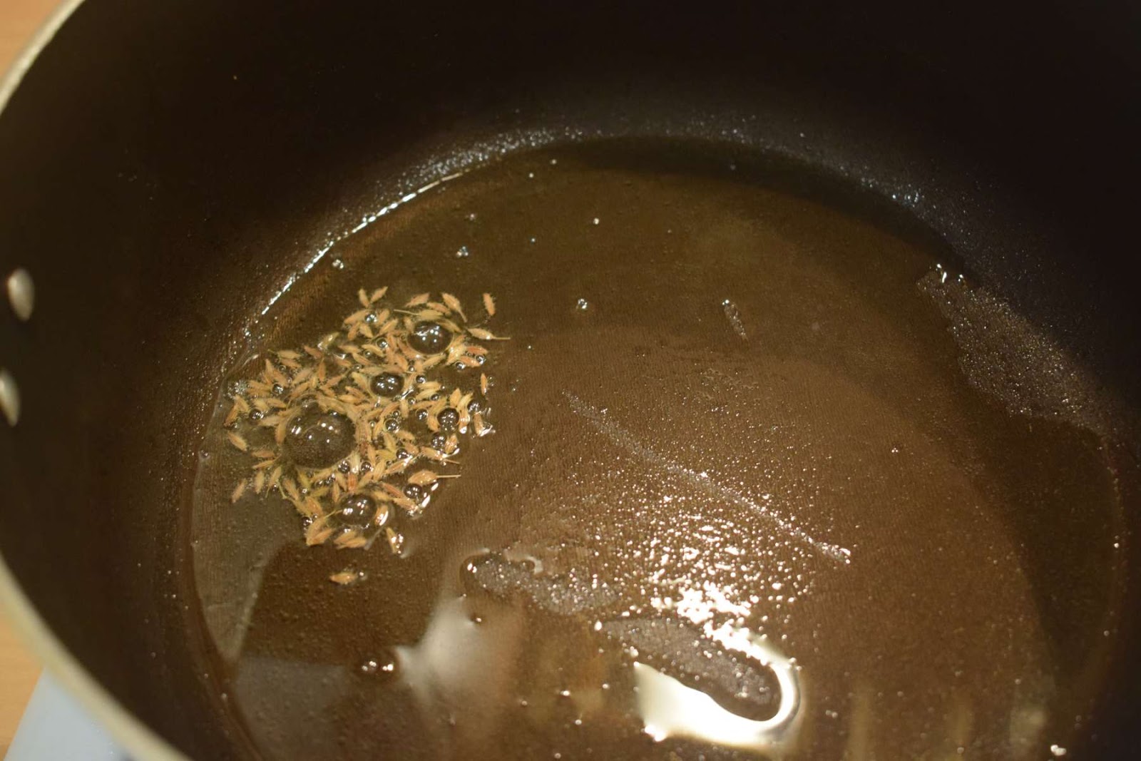 - Once the Oil is hot, add Cumin seeds (Jeera) and let them crackle.