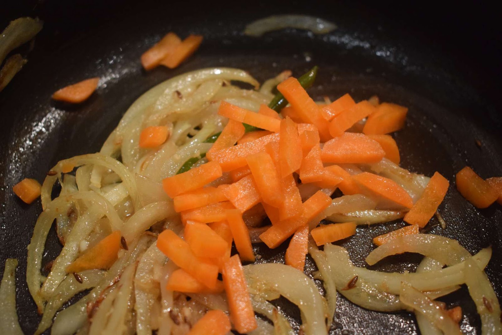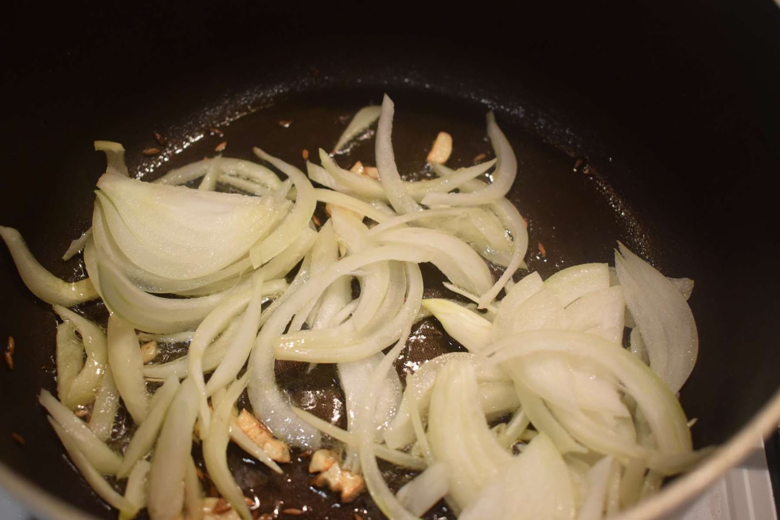 - Add Onions and cook it for 2-3 minutes in medium high flame until they become translucent.