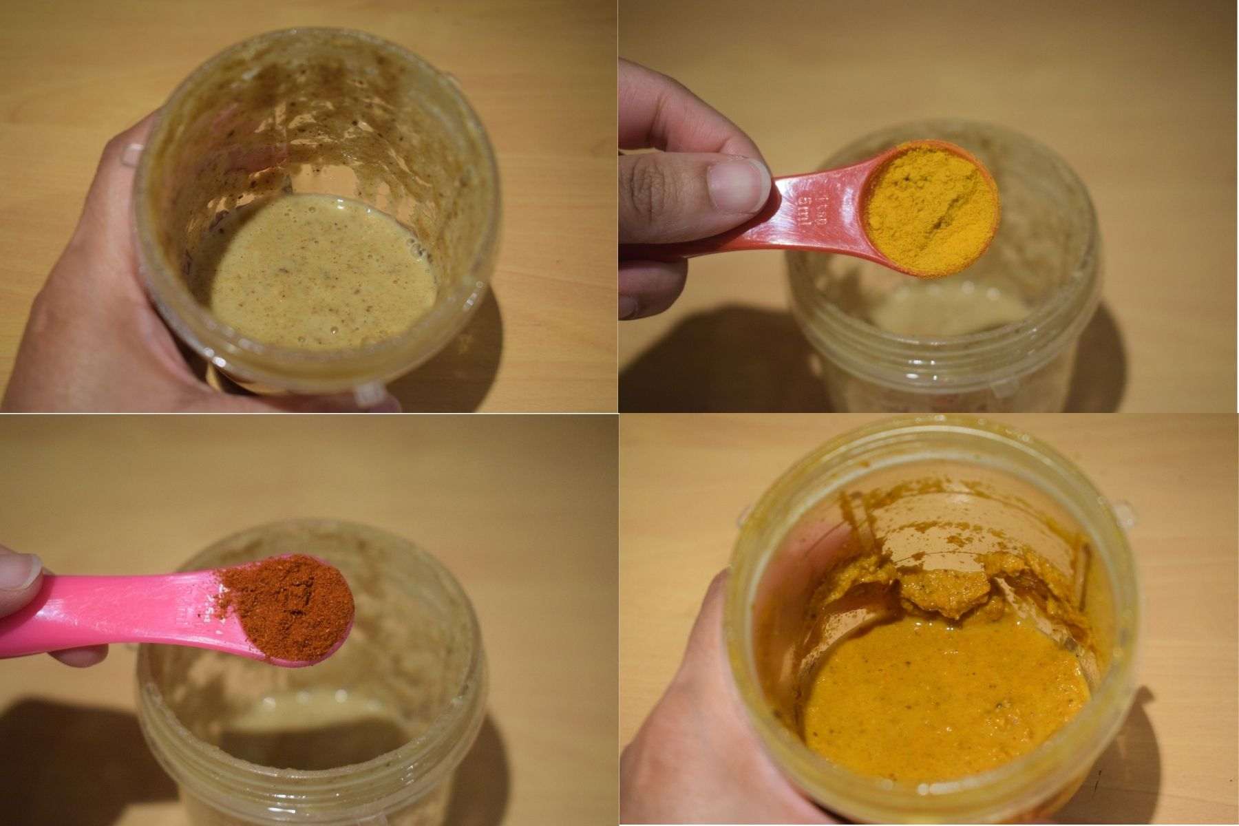 - Add turmeric powder, chilli powder into the jar and blend it once more. Keep the masala aside.