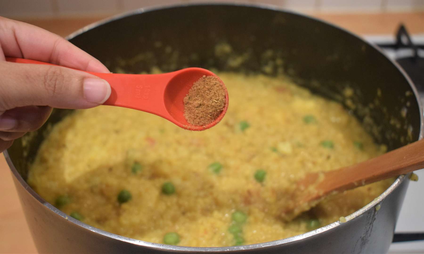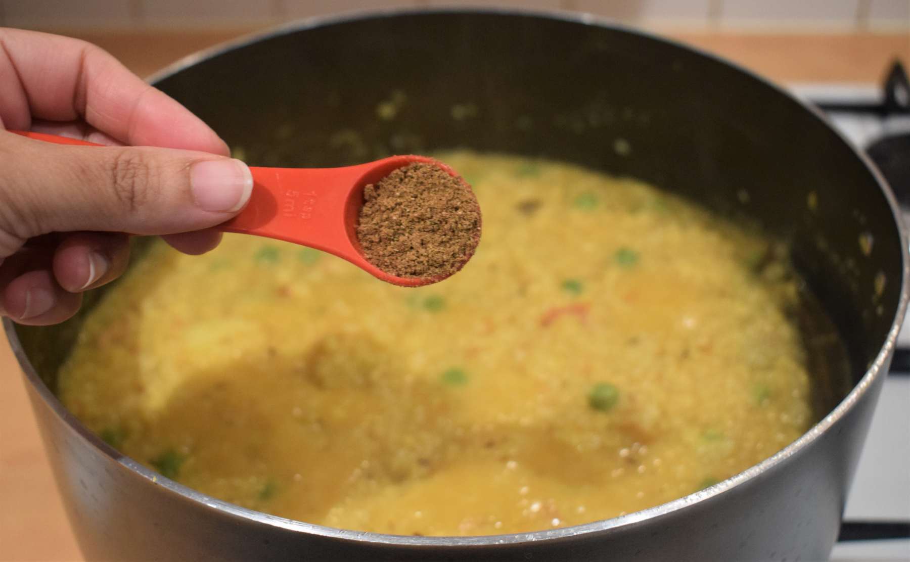 - Add Bengali garam masala powder, ghee, roasted cumin powder into the pan and mix it nicely.