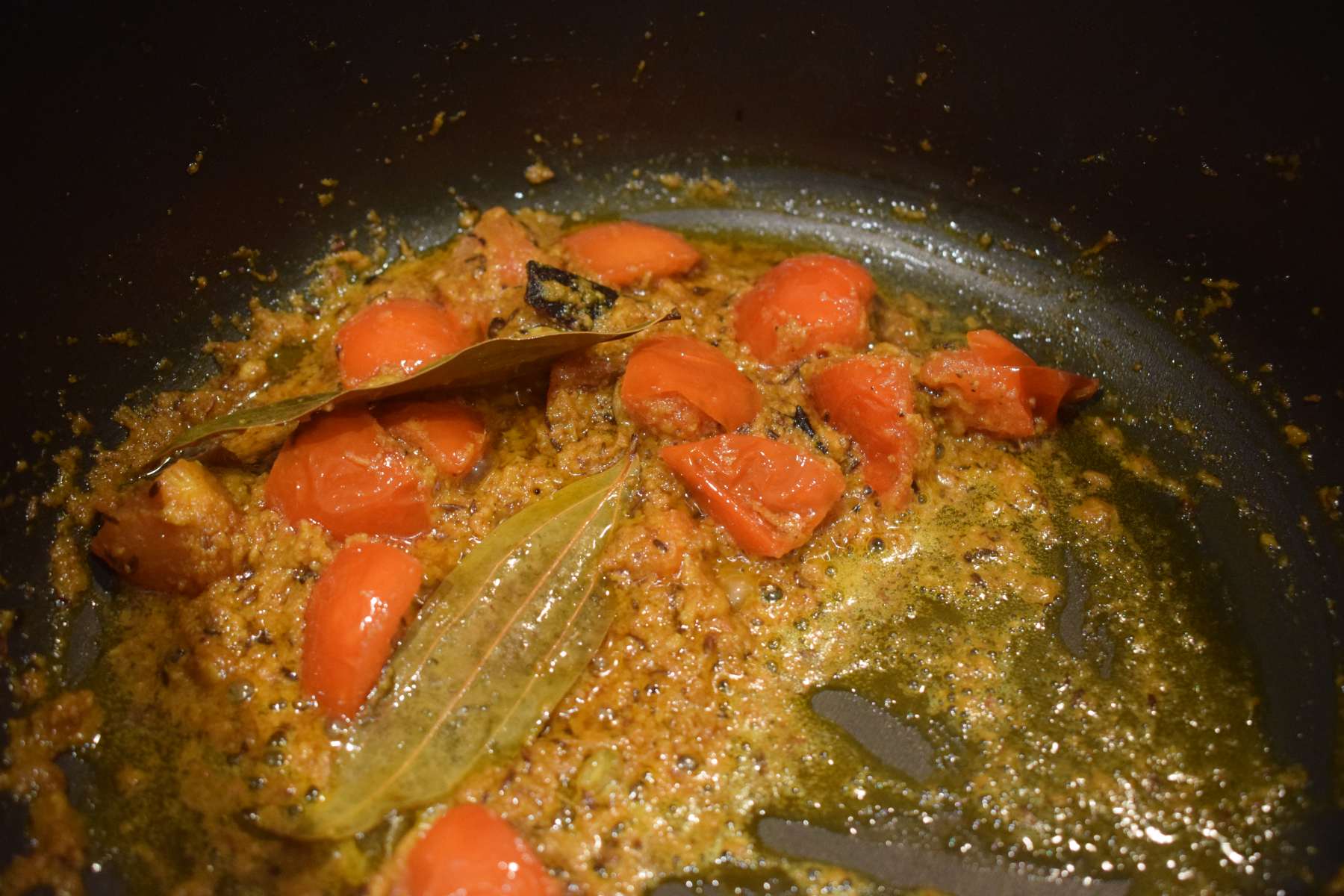- Add 3-4 tablespoons of water into the pan and cook the masala until it releases oil.