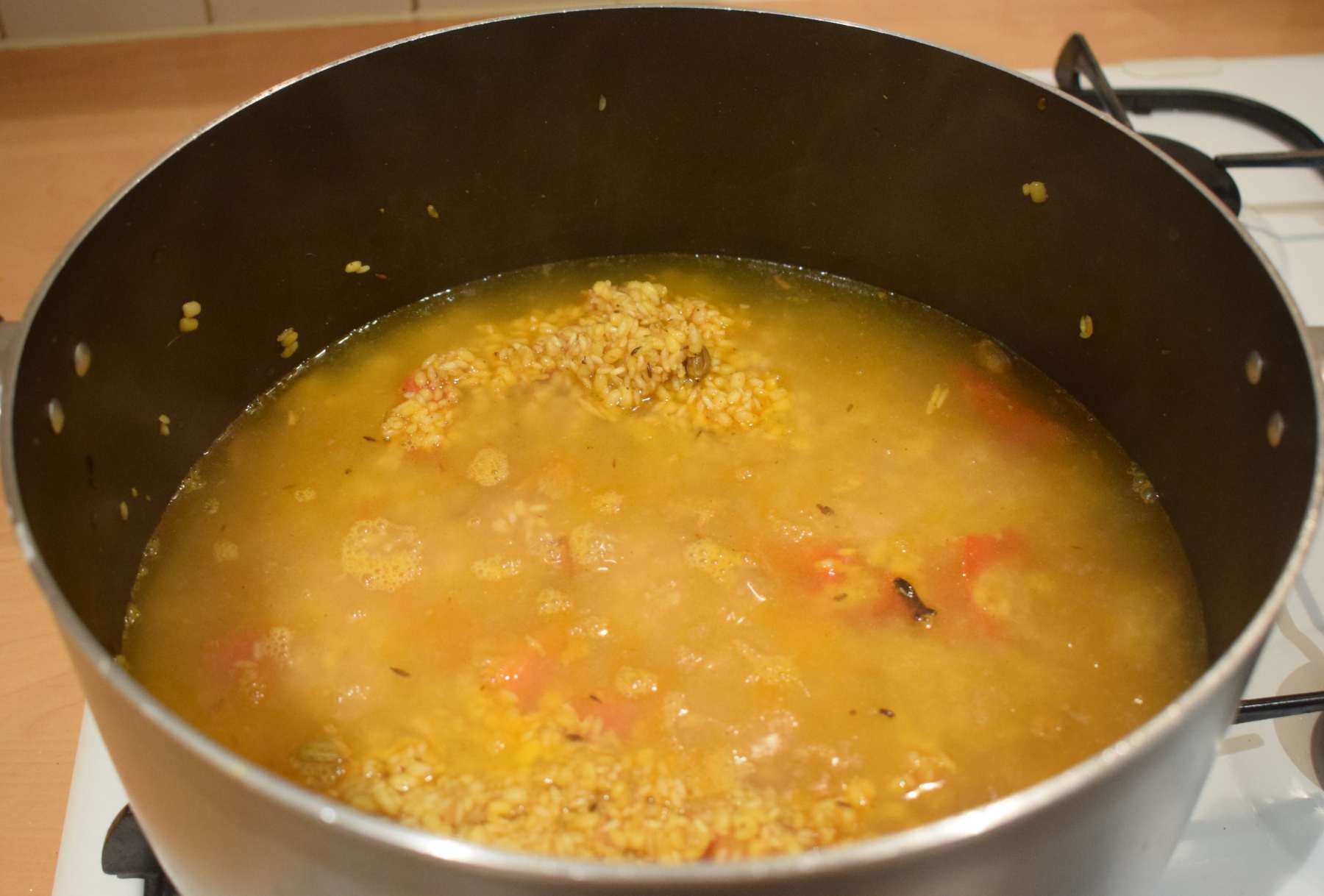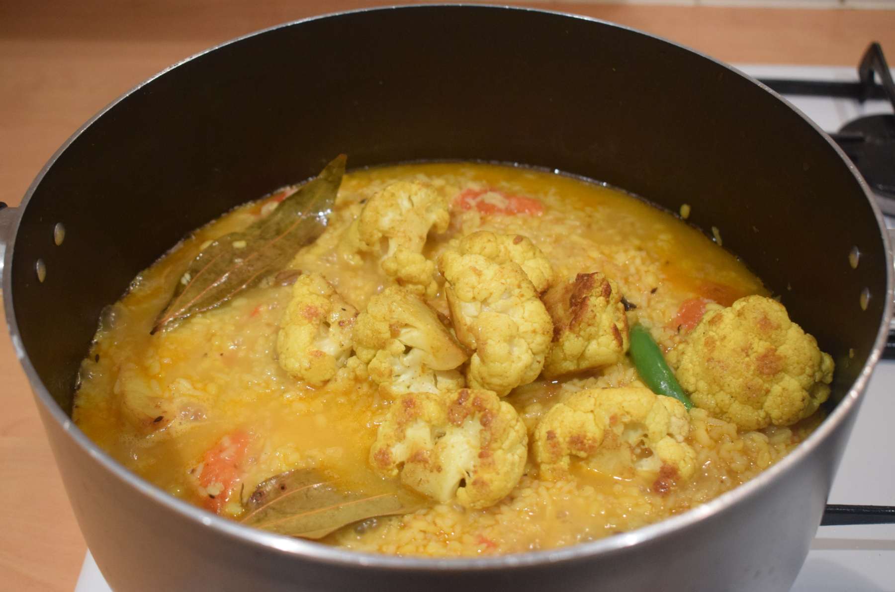 - Cover the pan and cook them in low flame until the dal gets cooked. Don’t forget to scrap the bottom on regular intervals or else the khichuri will stick to the bottom of the pan. Add more water in between if required. For me it took ½ cup more of water. The consistency of Bhoger khichuri is neither too thick nor too runny.