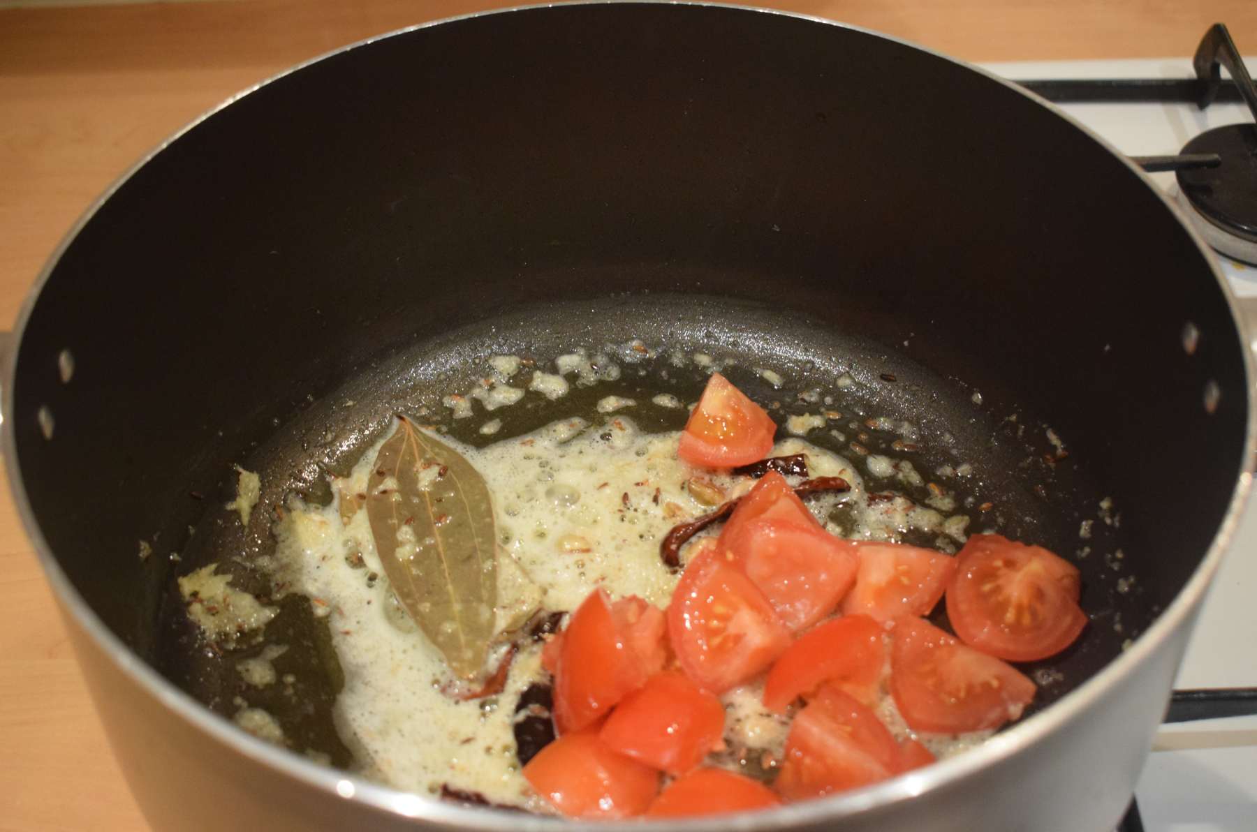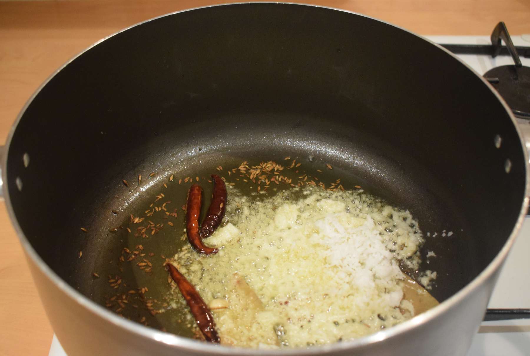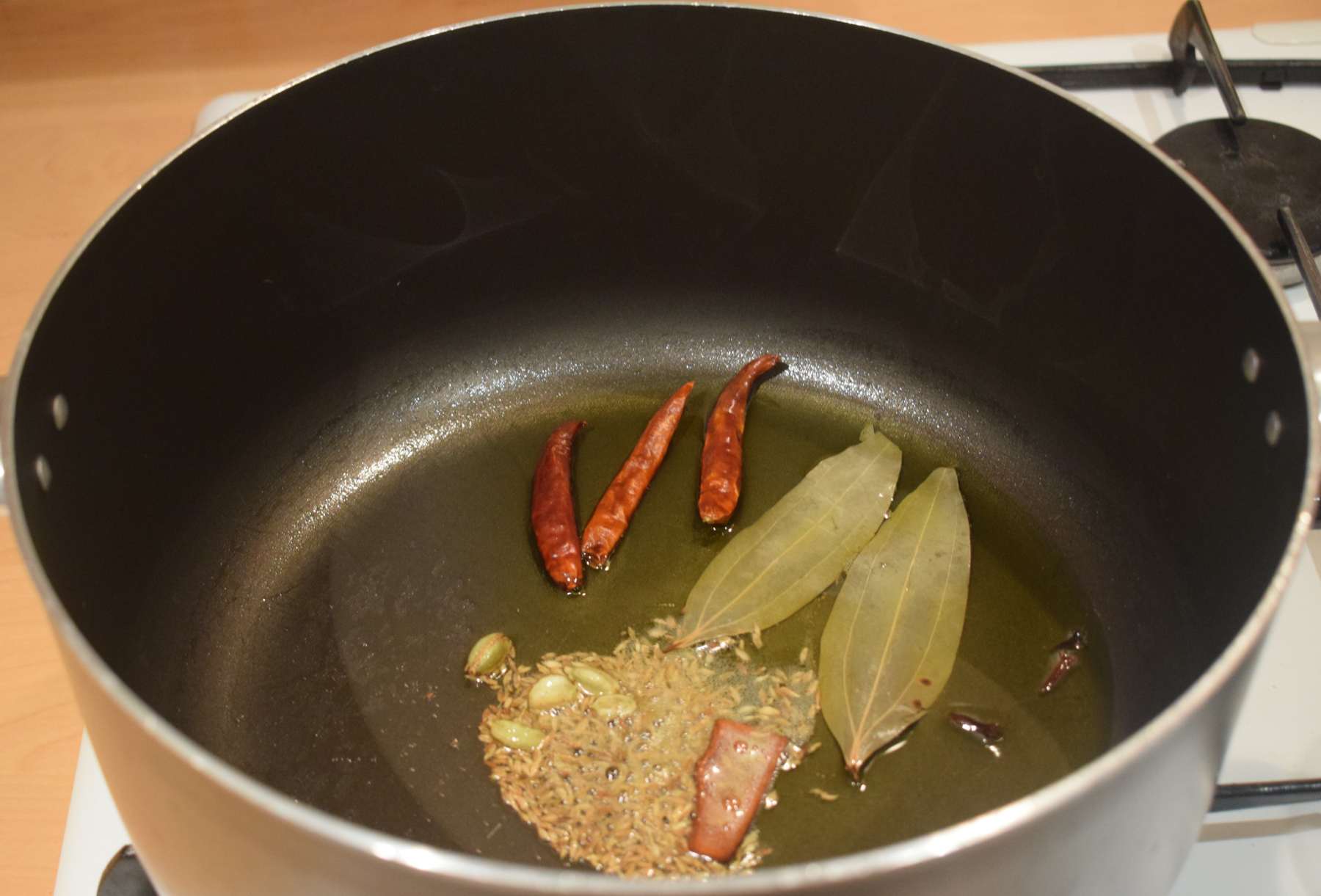 - Add whole spices cumin seeds, dry red chillies, cinnamon stick, cloves, cardamoms, bay leaves for tempering. Let the spices get crackle.