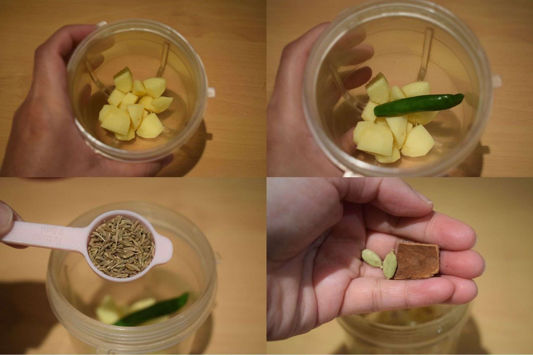 - For the masala, add the ginger pieces into the small jar of the grinder. Then add green chilli, cinnamon stick, cardamom into the jar. Add a little bit of water around 3 tablespoons and pulse the spices to a smooth paste.