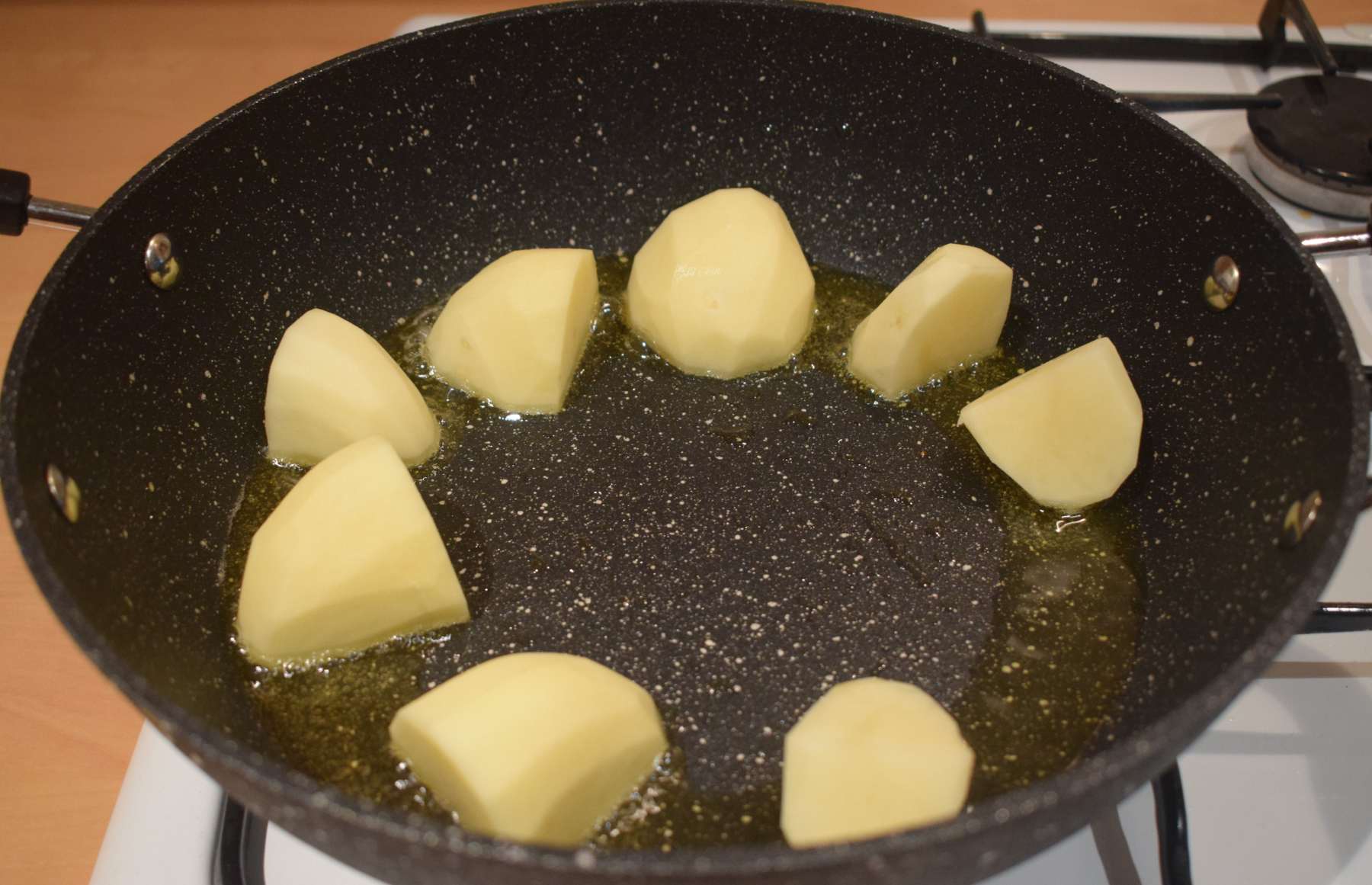 - Fry them on high flame until the potato chunks become evenly crispy golden brown from all sides. Transfer them on a separate plate.
