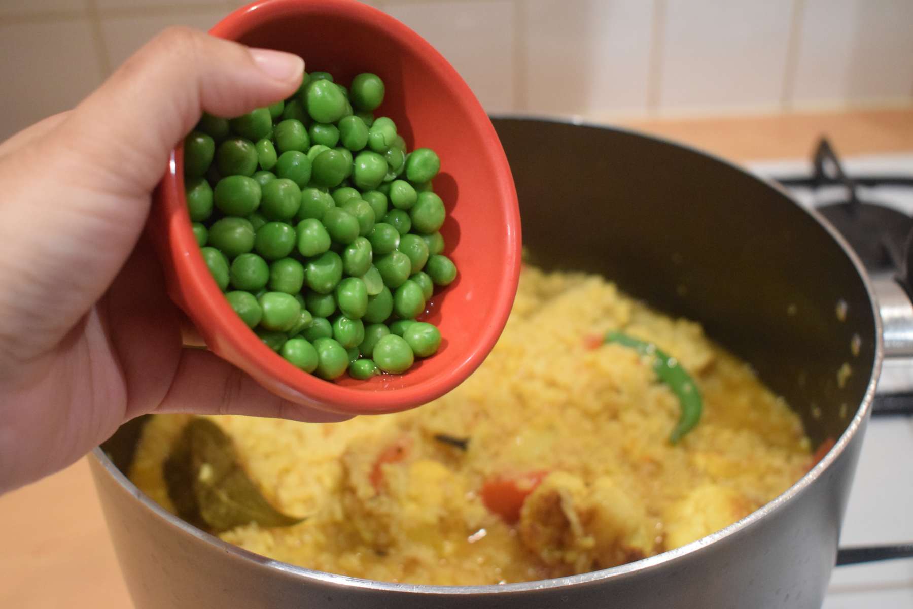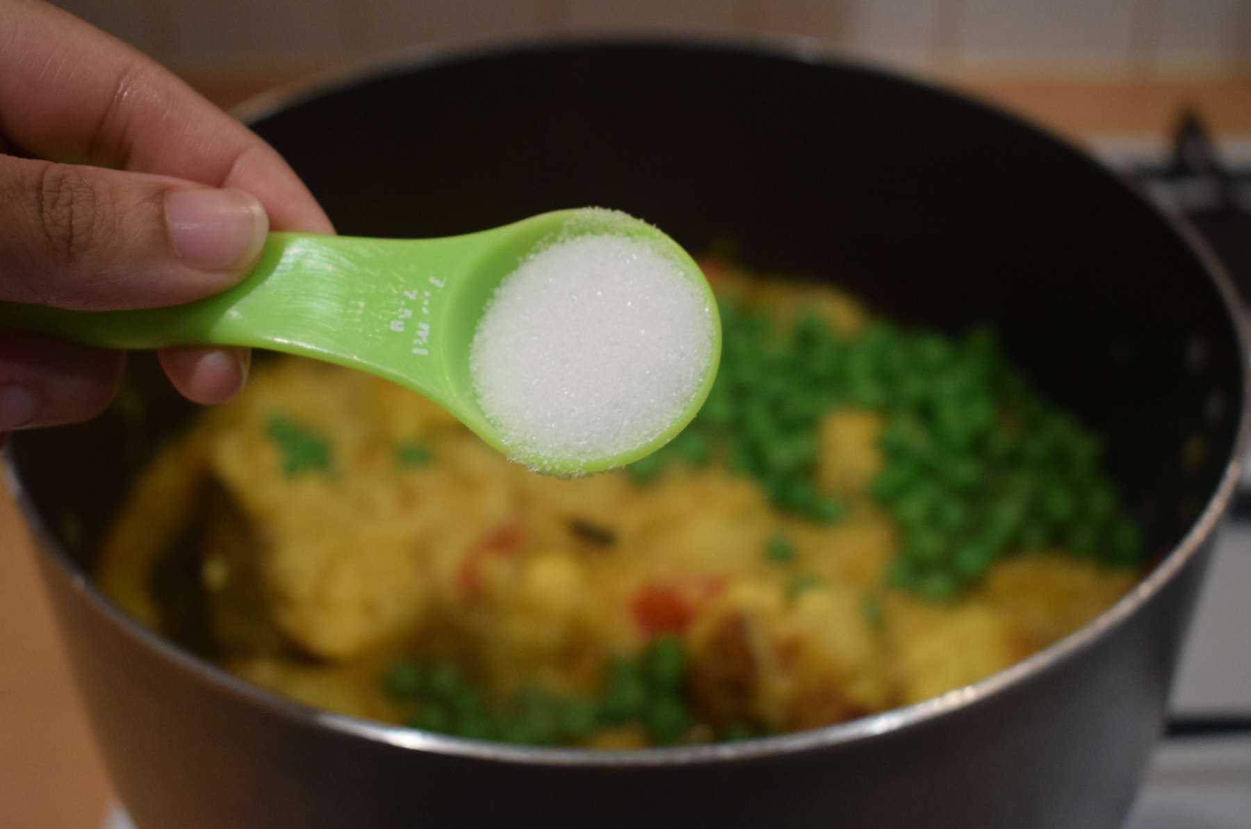 - Add the cauliflower florets, blanched green peas, sugar into the pan and give a nice mix.