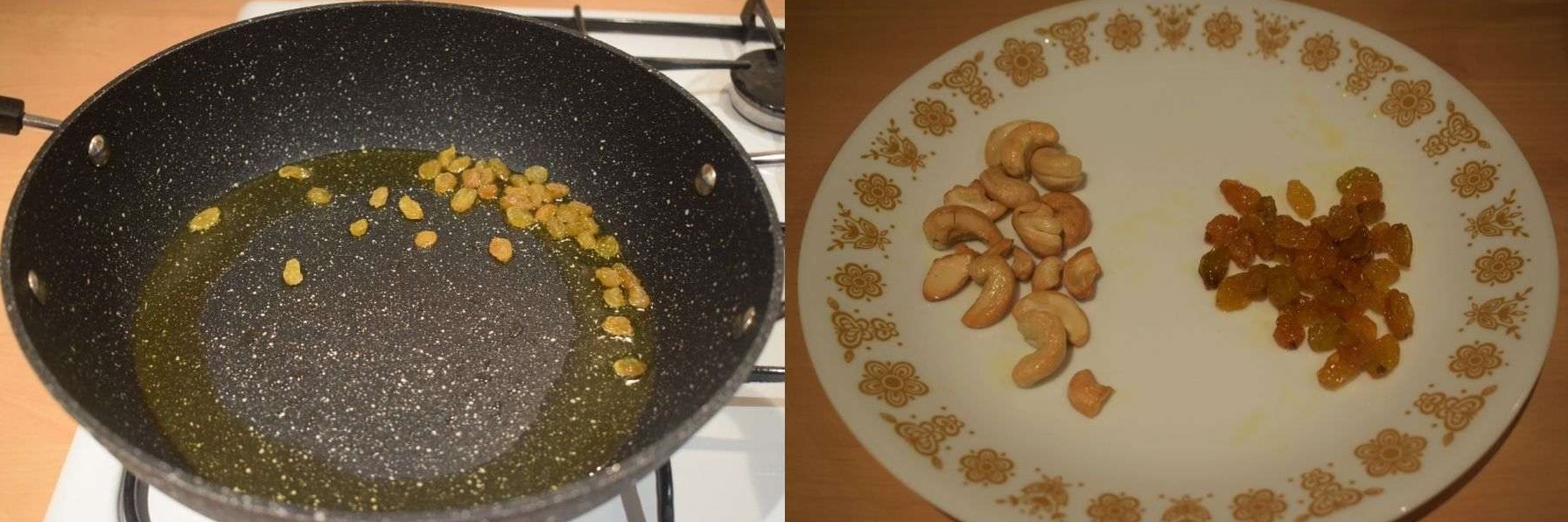 - Add raisins into the pan and fry them till they plump up. Keep them aside on a separate plate.