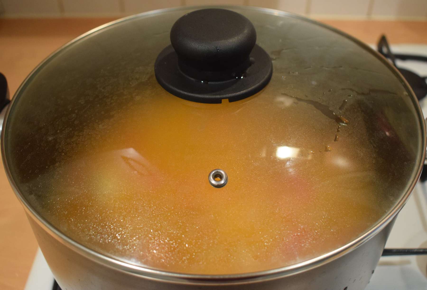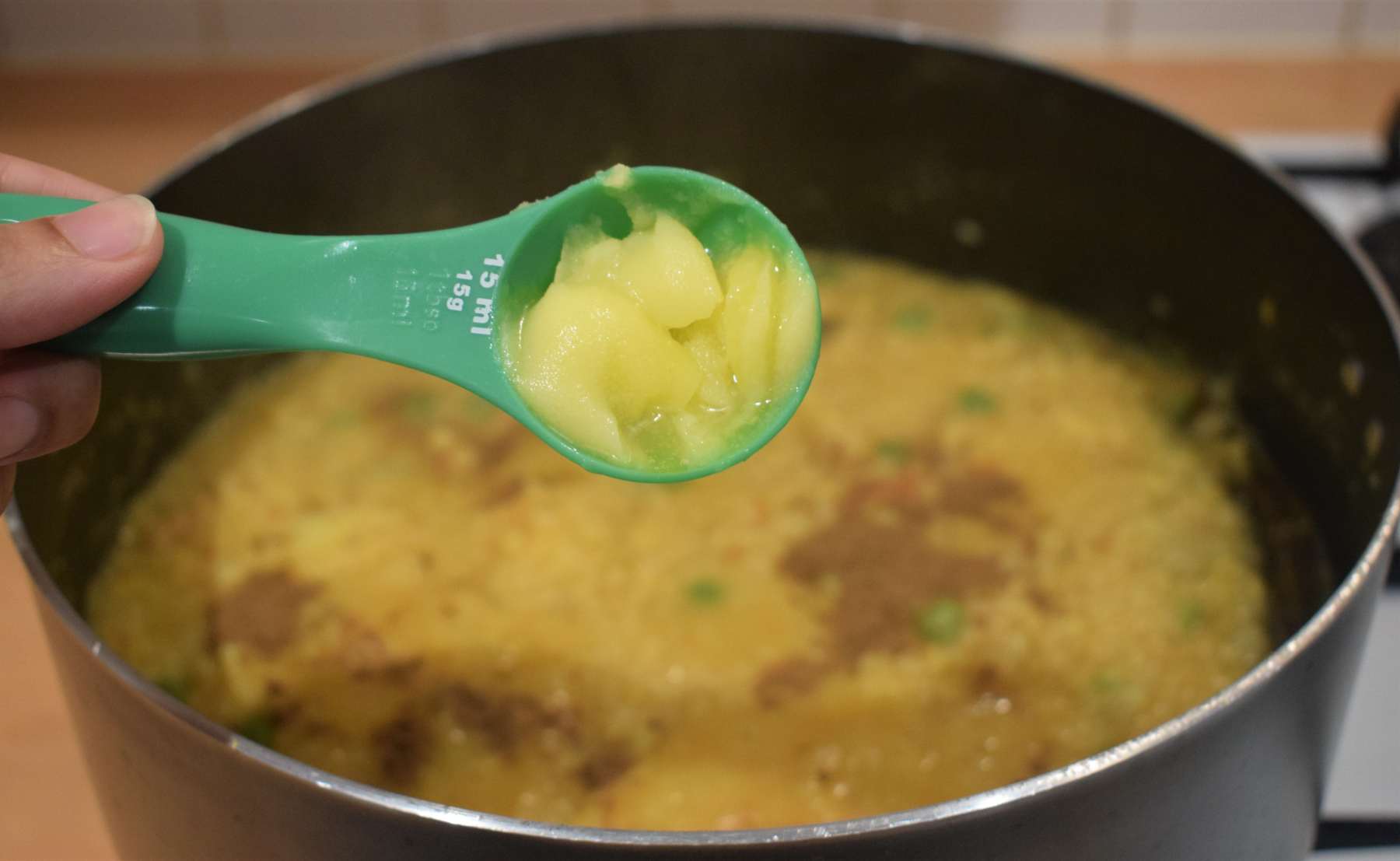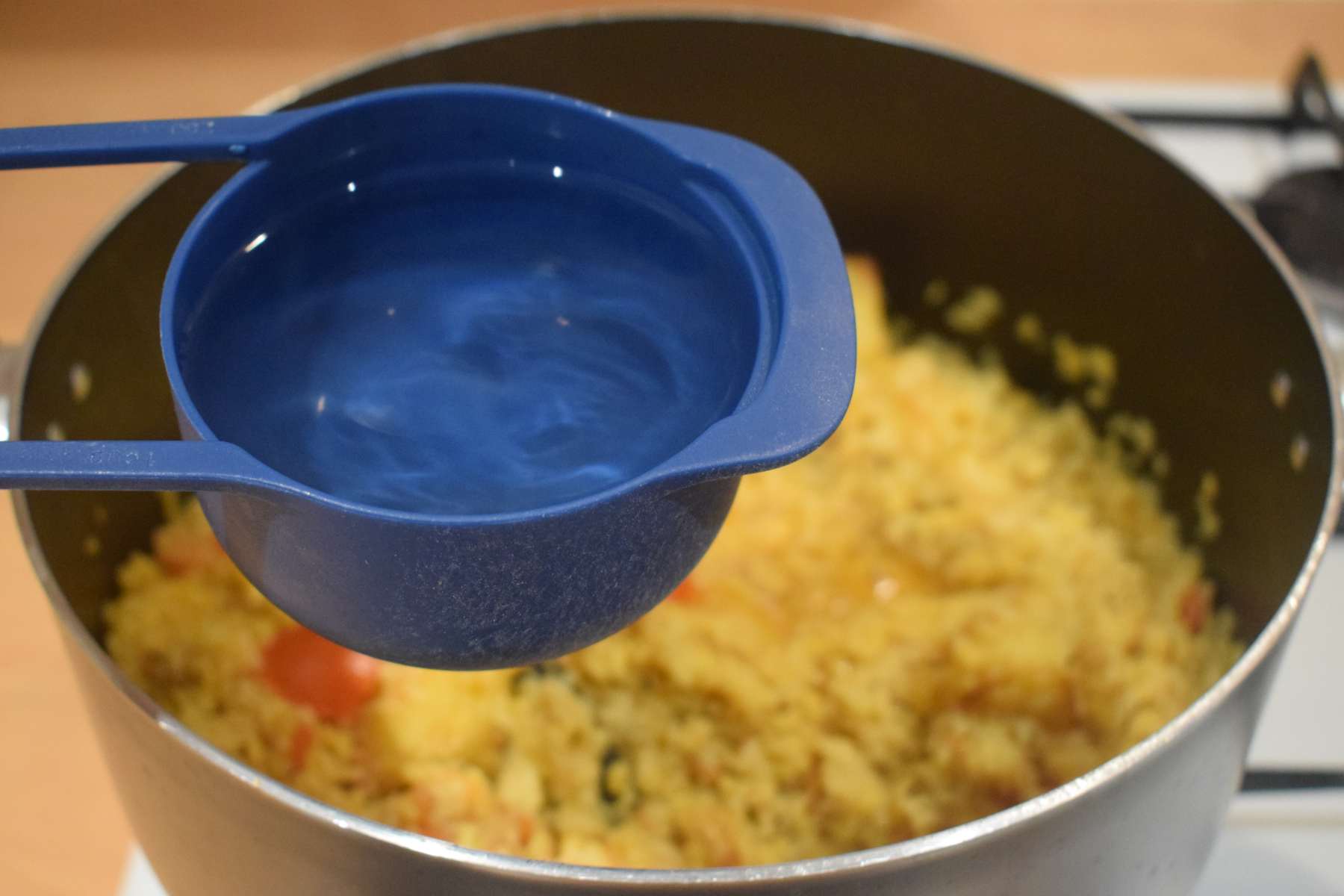 - Add 1 litre or 4 cups of hot water into the pan and give a nice mix.