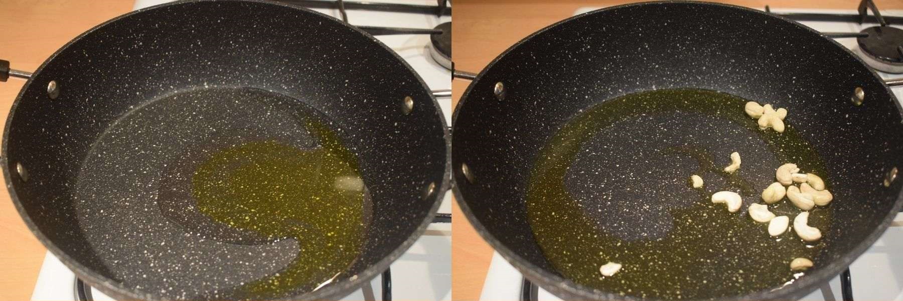 - Take a pan and add mustard oil into it. Once the oil is hot, add cashew nuts into it and fry them till golden. Keep the cashews on a separate plate.