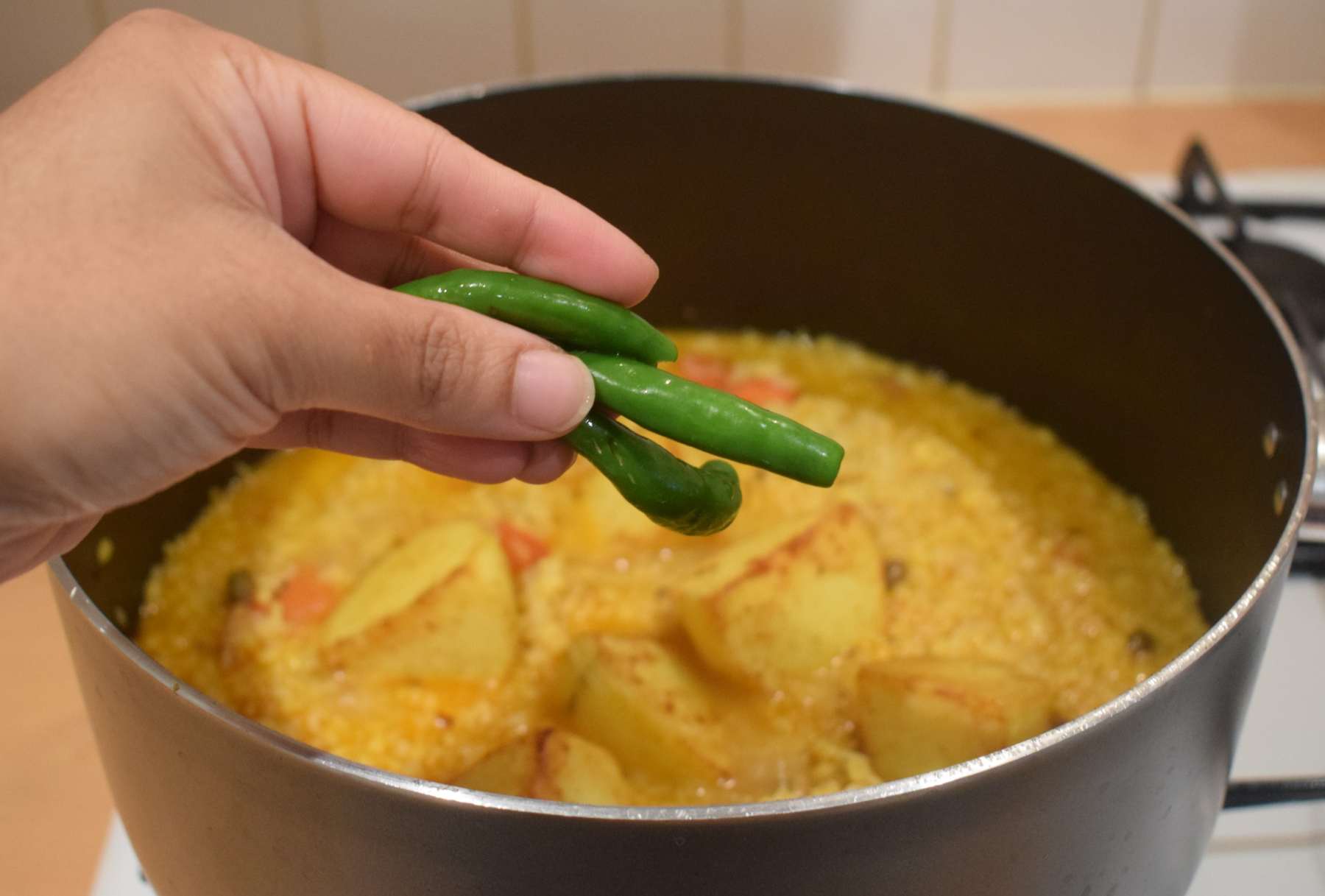 - Add potato chunks, green chillies into the pan and mix it. Cover the pan and cook it in low flame until the water gets absorbed. Scrap it from the bottom, if required.