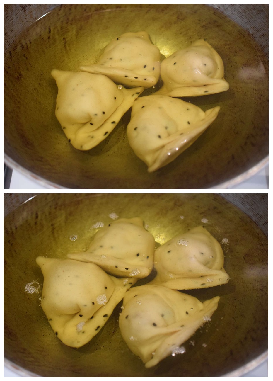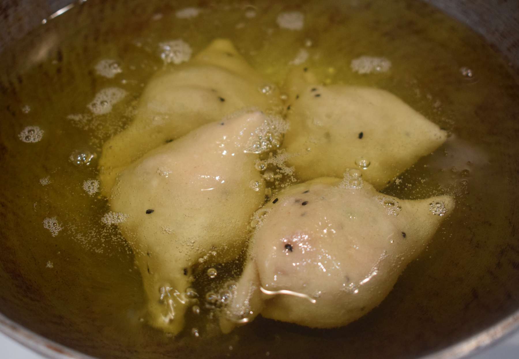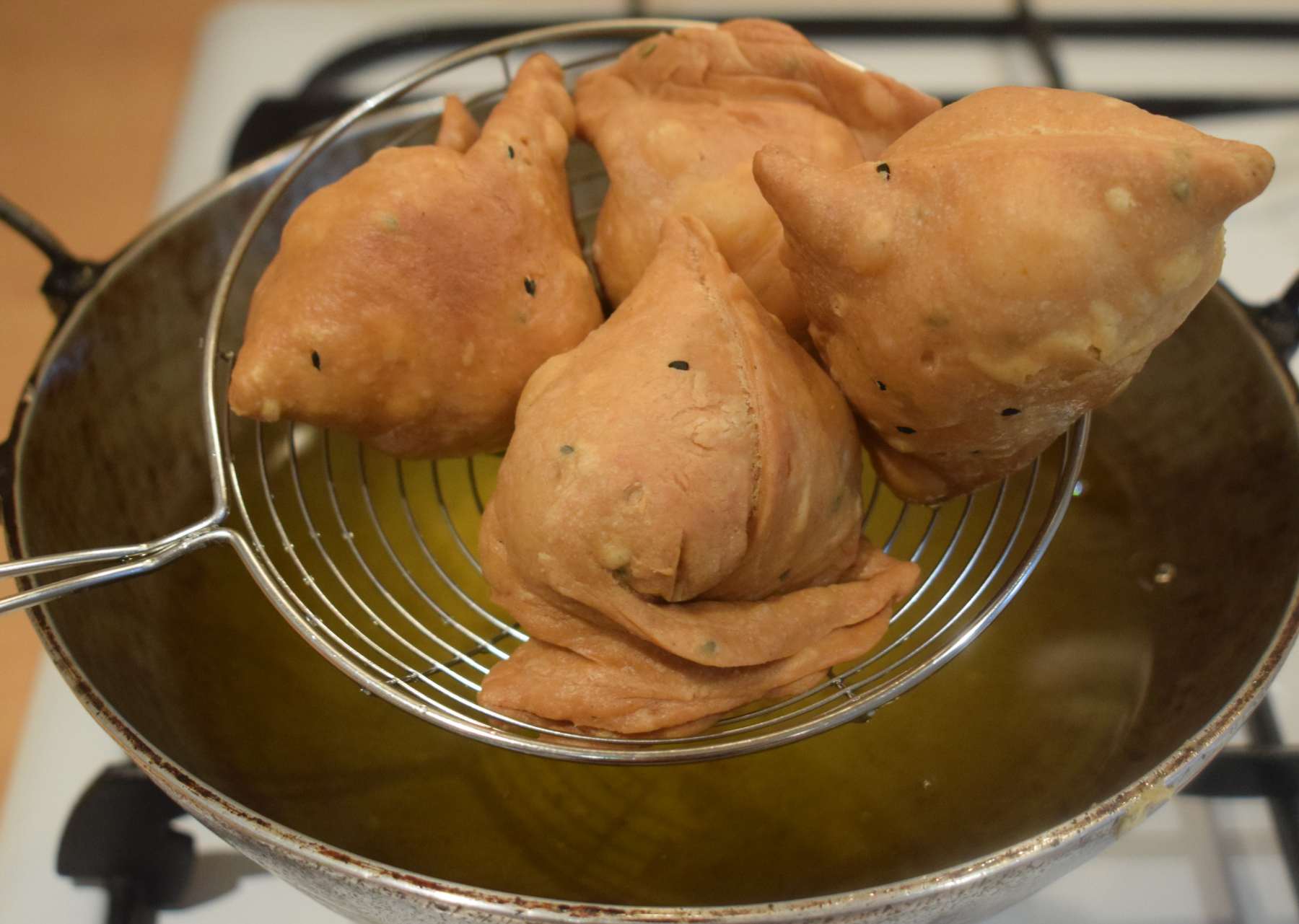 - Fry them evenly till golden brown. Turn in between if required to cook it evenly. One Singara batch takes at least 20-25 minutes to get fried properly.