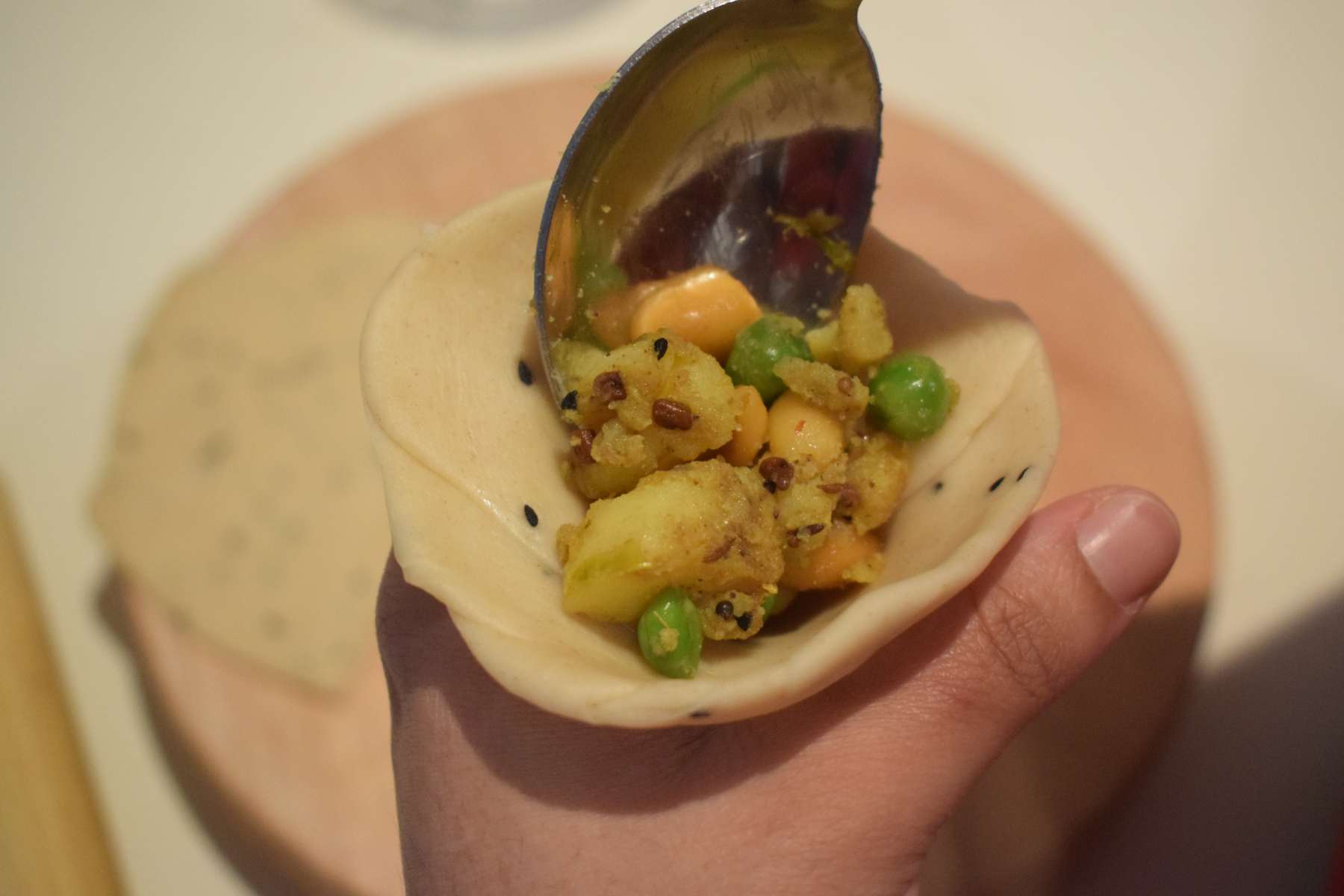 - Apply water into the edge of the cut side of the chapati and make a cone with it. Press the fold gently to tuck it properly.