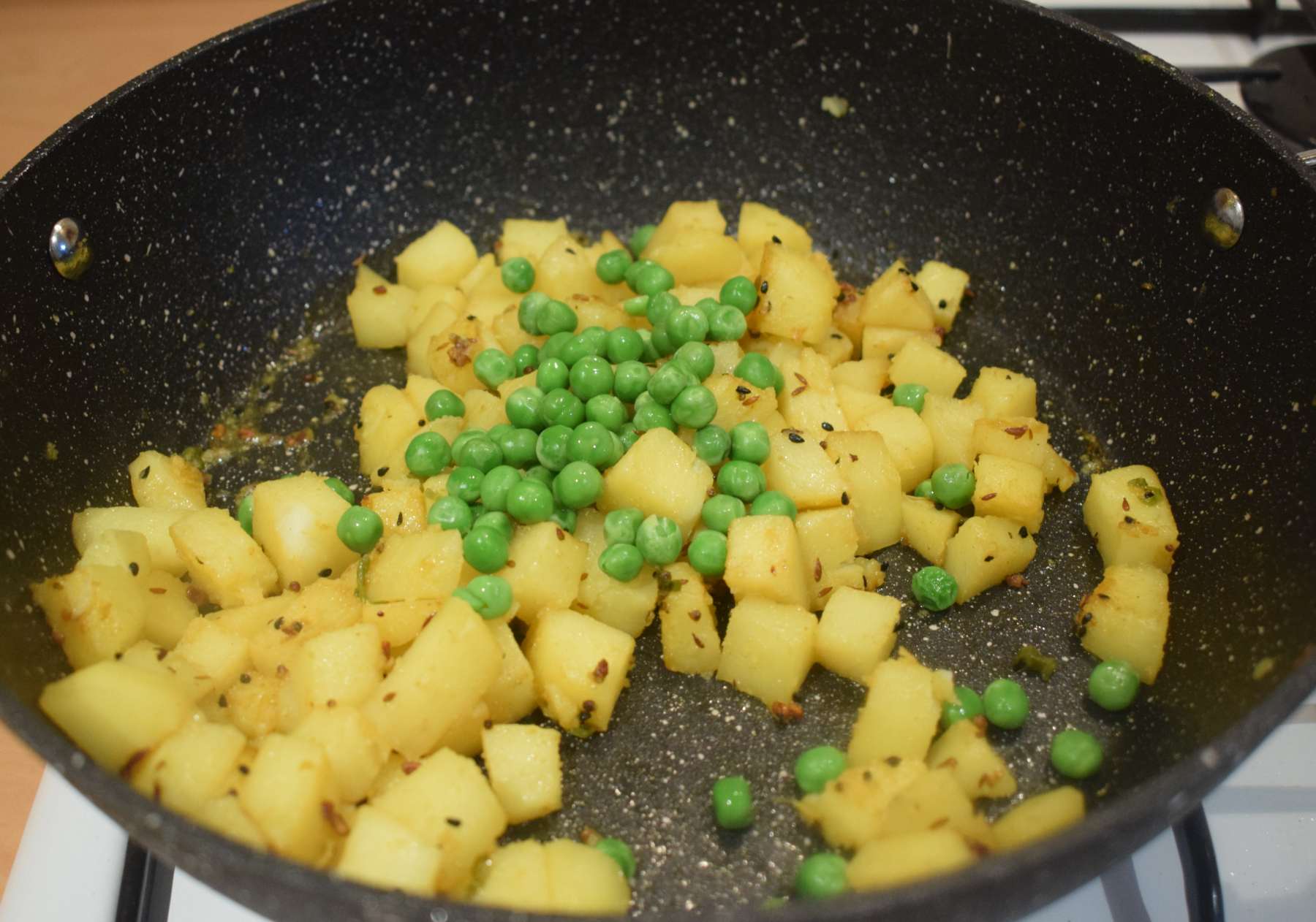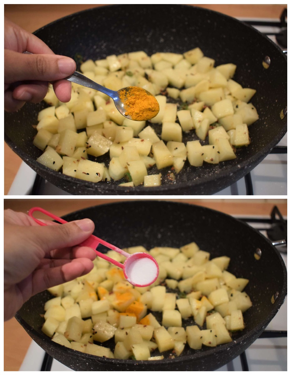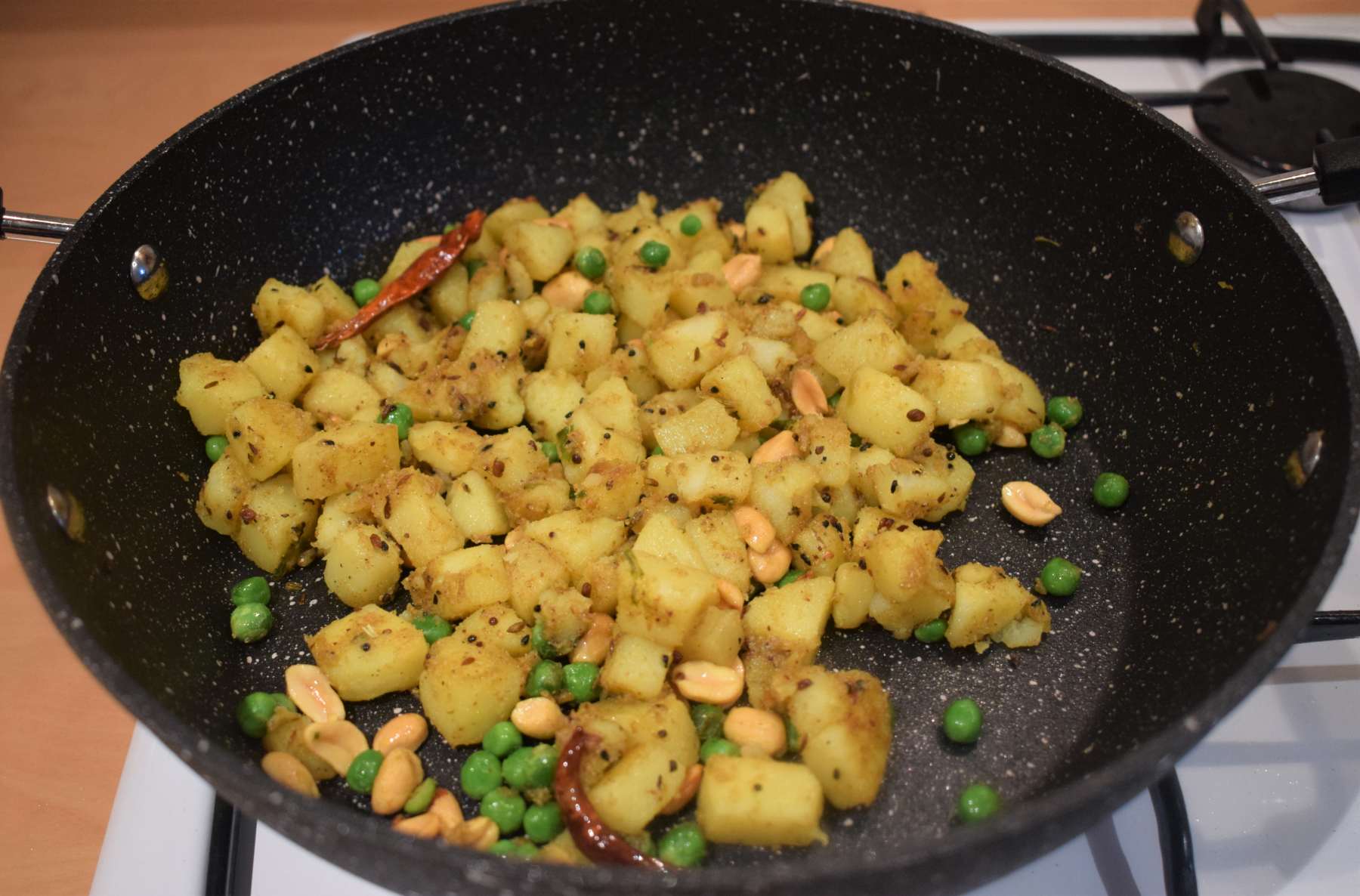 - Again, cover the pan and cook it in low flame until the potatoes become tender but not mushy.
