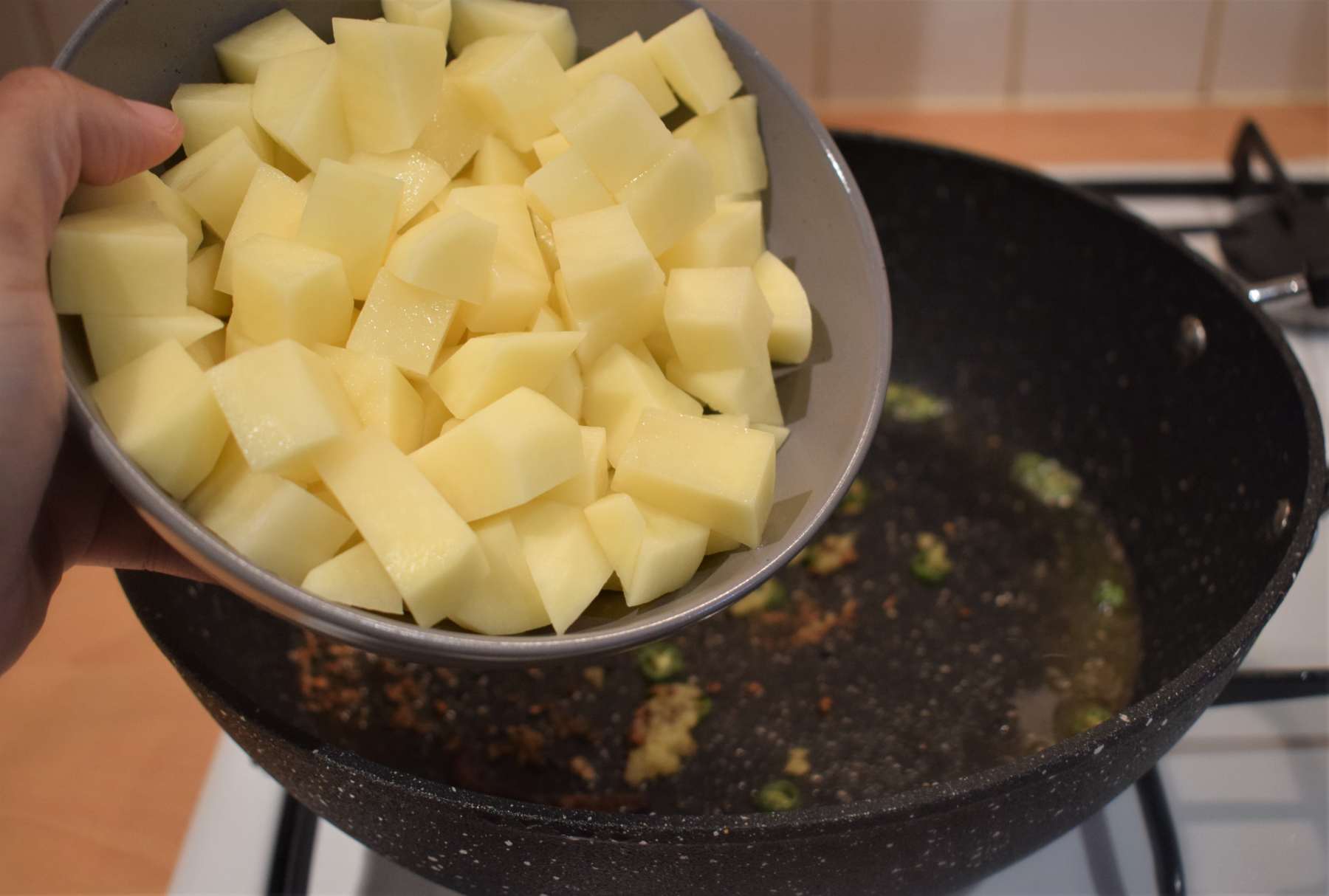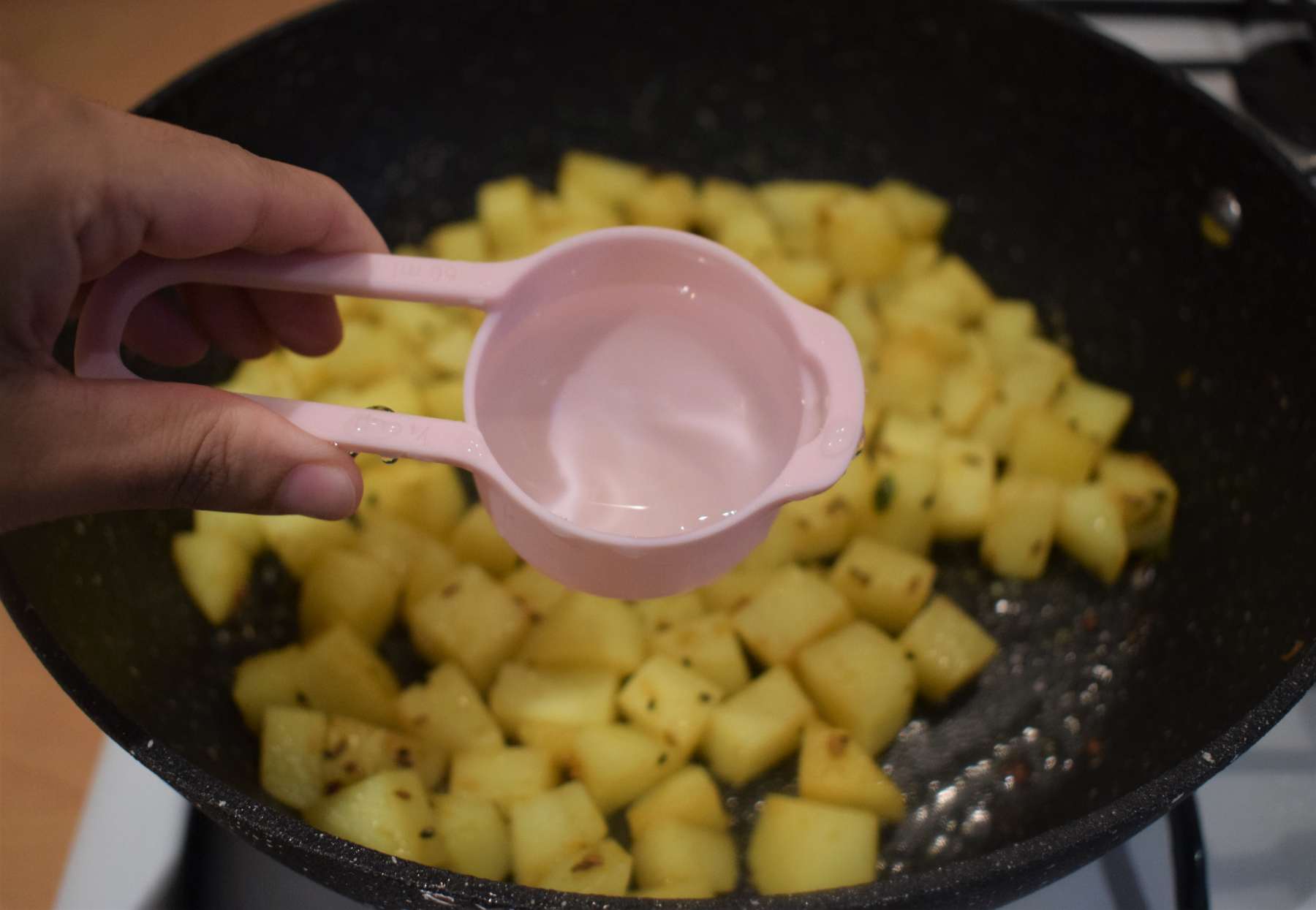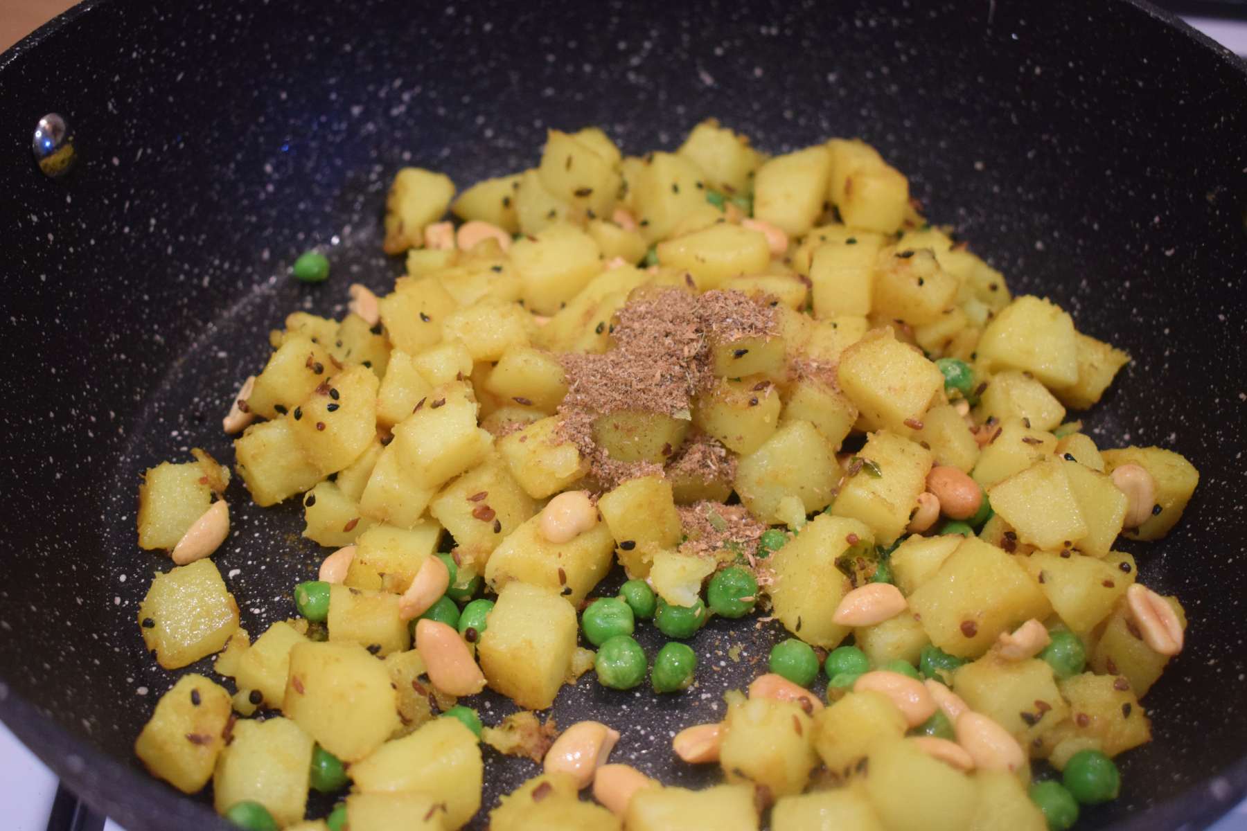 - Again, cover the pan and cook it in low flame until the potatoes become tender but not mushy.