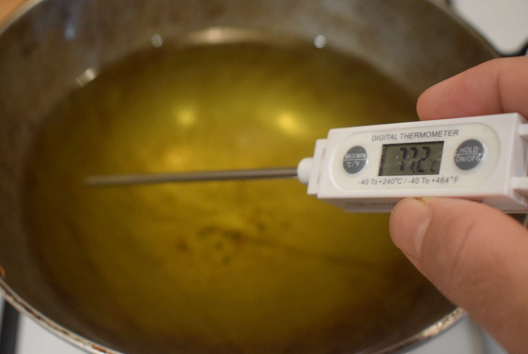 - Put the flame in low and allow the oil to become warm. The ideal temperature for frying samosas is 70° C-90° C. At this stage, you can dip your finger as well to check the temperature of oil.