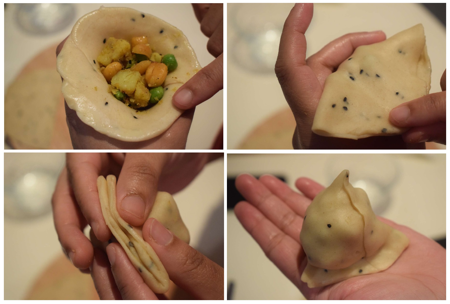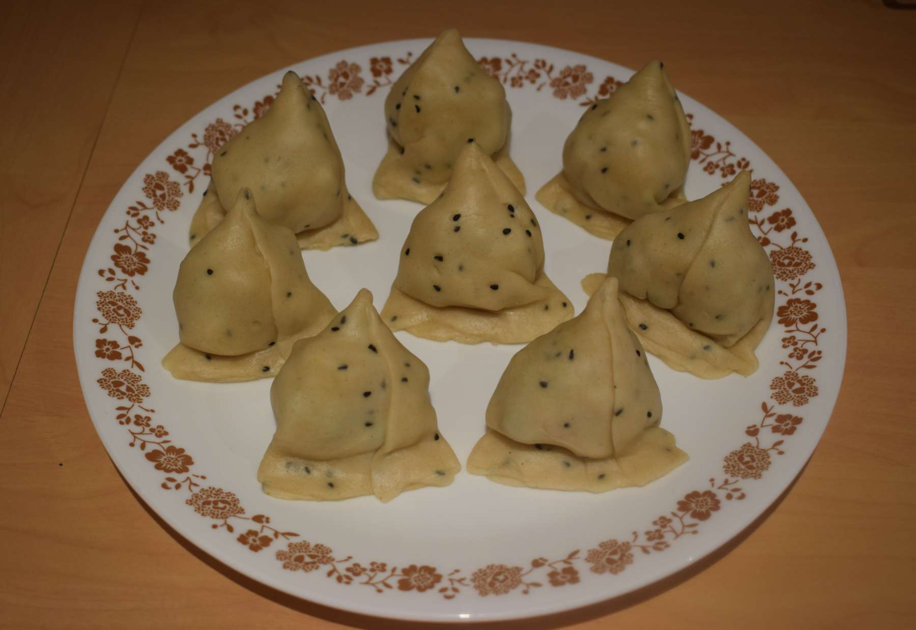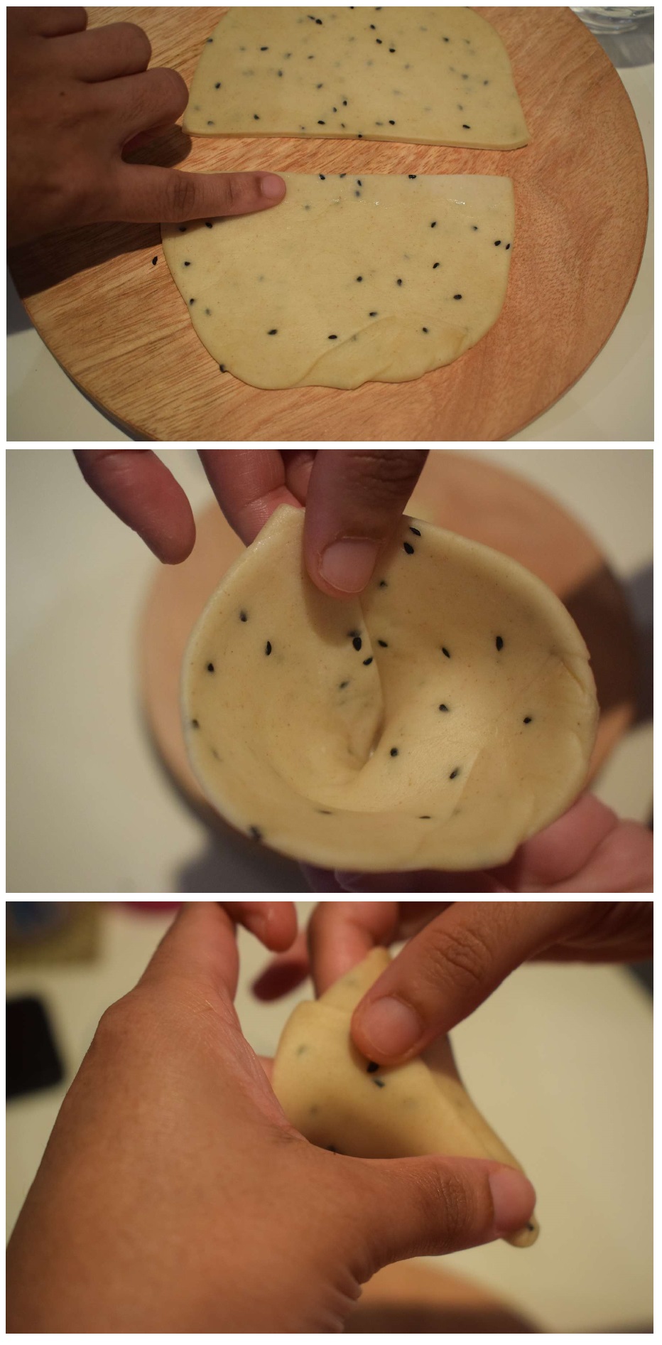 - Repeat the whole process and shape singara with rest of the dough and filling.