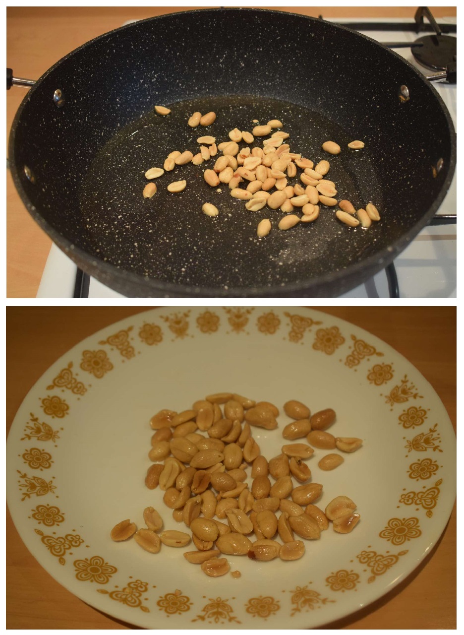 - Once the oil is hot, add 2 tablespoons peanuts and fry them over medium flame for 1-2 minutes and transfer them on a separate plate.