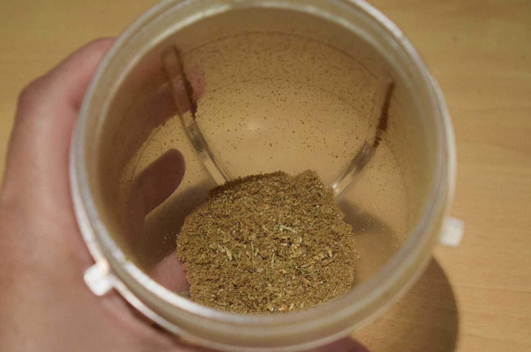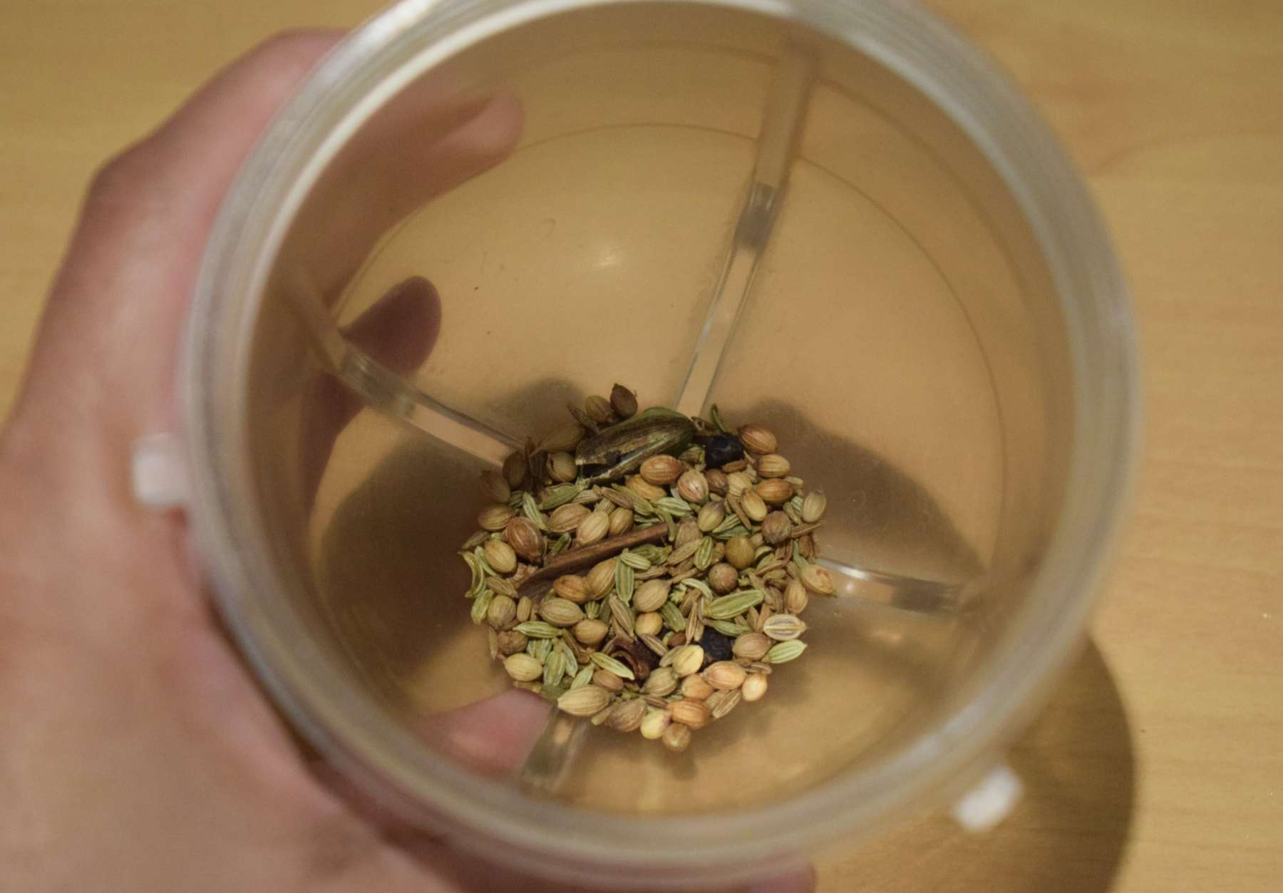 - Transfer the spices into the jar of a grinder and close the lid of the jar.