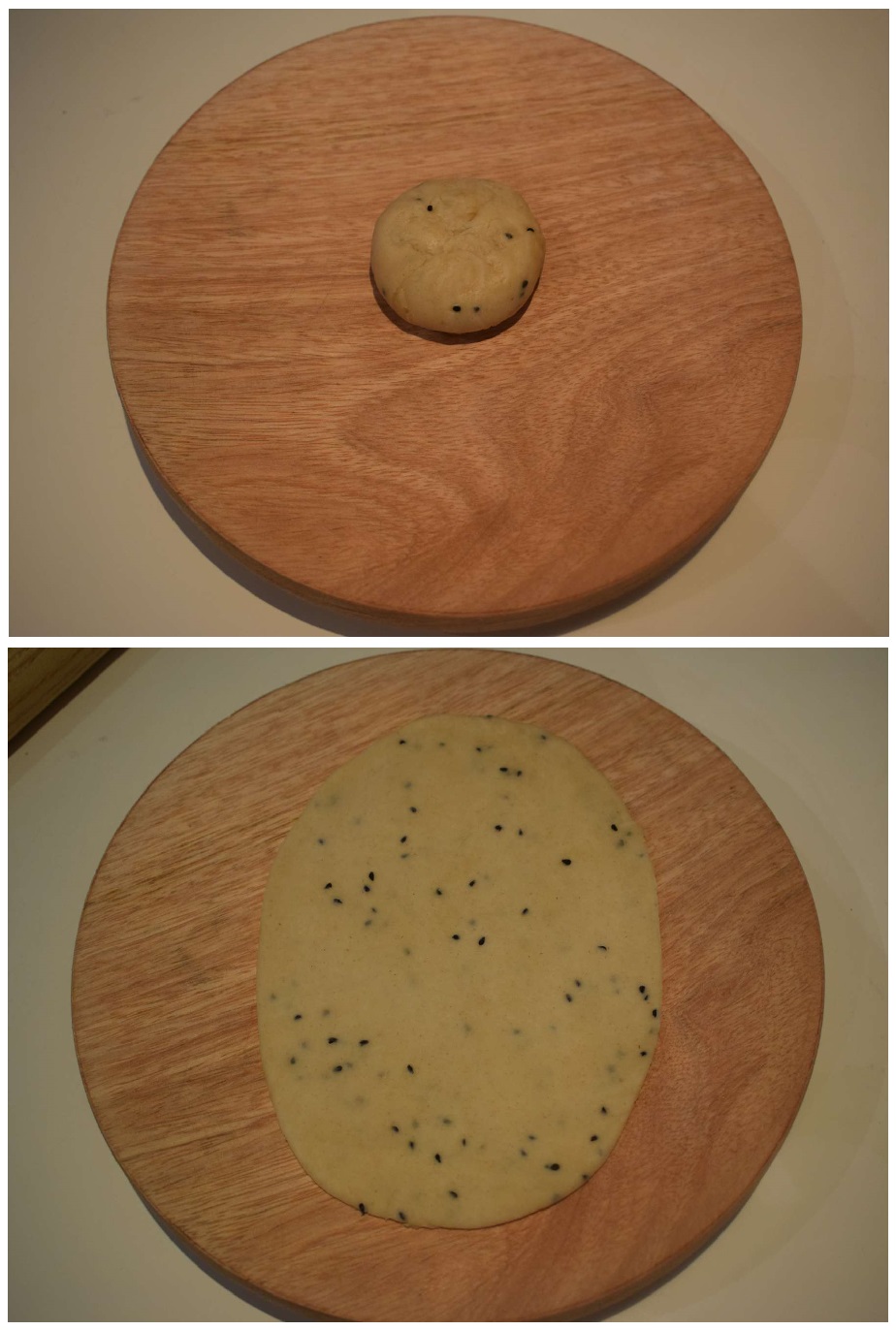 - Put a dough ball on a flat surface or on a rolling board. Then roll it to 1.5-2.0 mm thick oval shaped chapati.