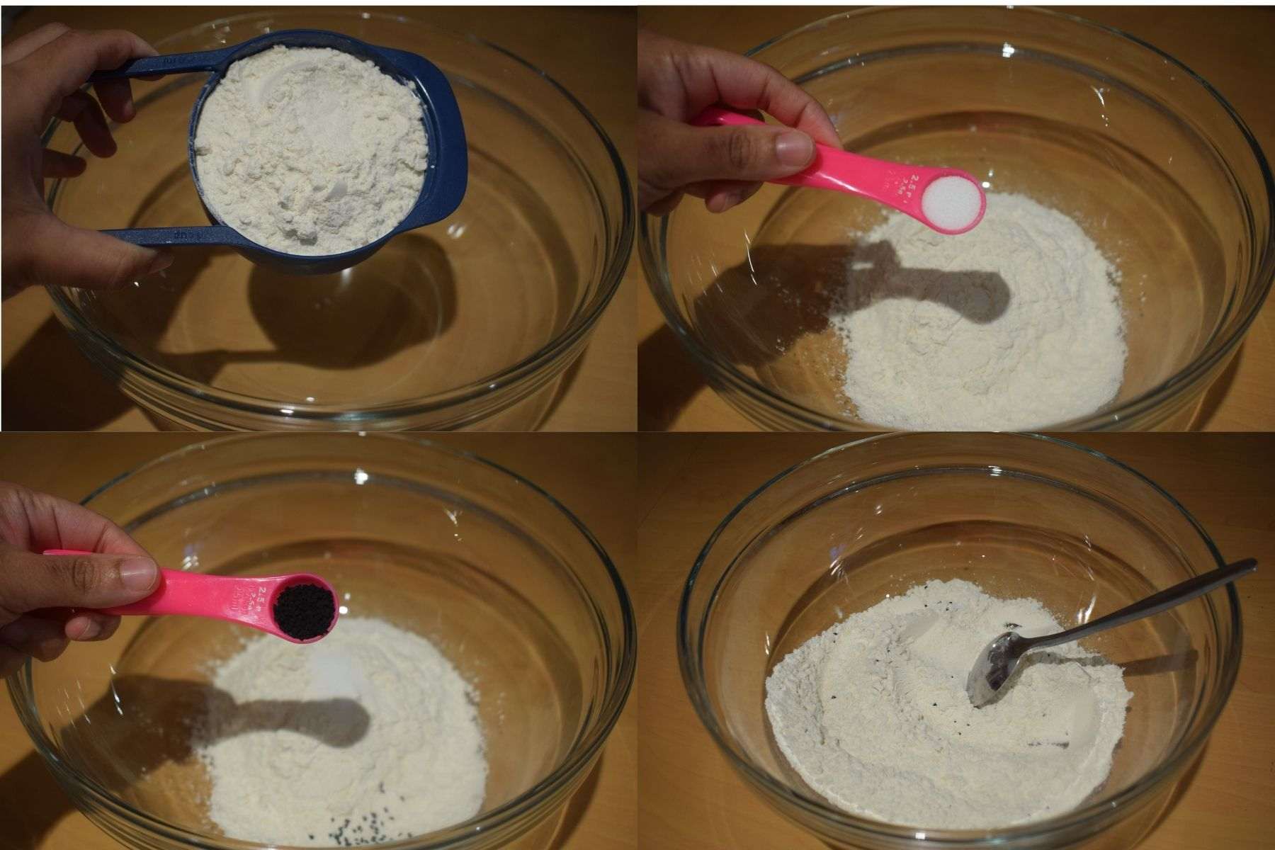 - Add ½ teaspoon salt, ½ teaspoon nigella seeds into it and mix all the dry ingredients with a spoon.