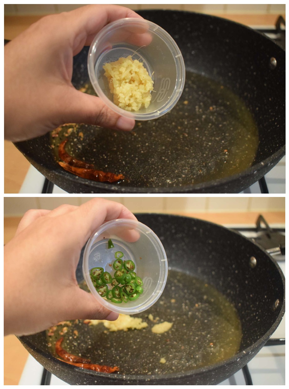 - Add ½ tablespoon grated ginger, thin sliced green chillies into the pan and cook them in low flame for 1-2 minutes until the raw smell disappears.