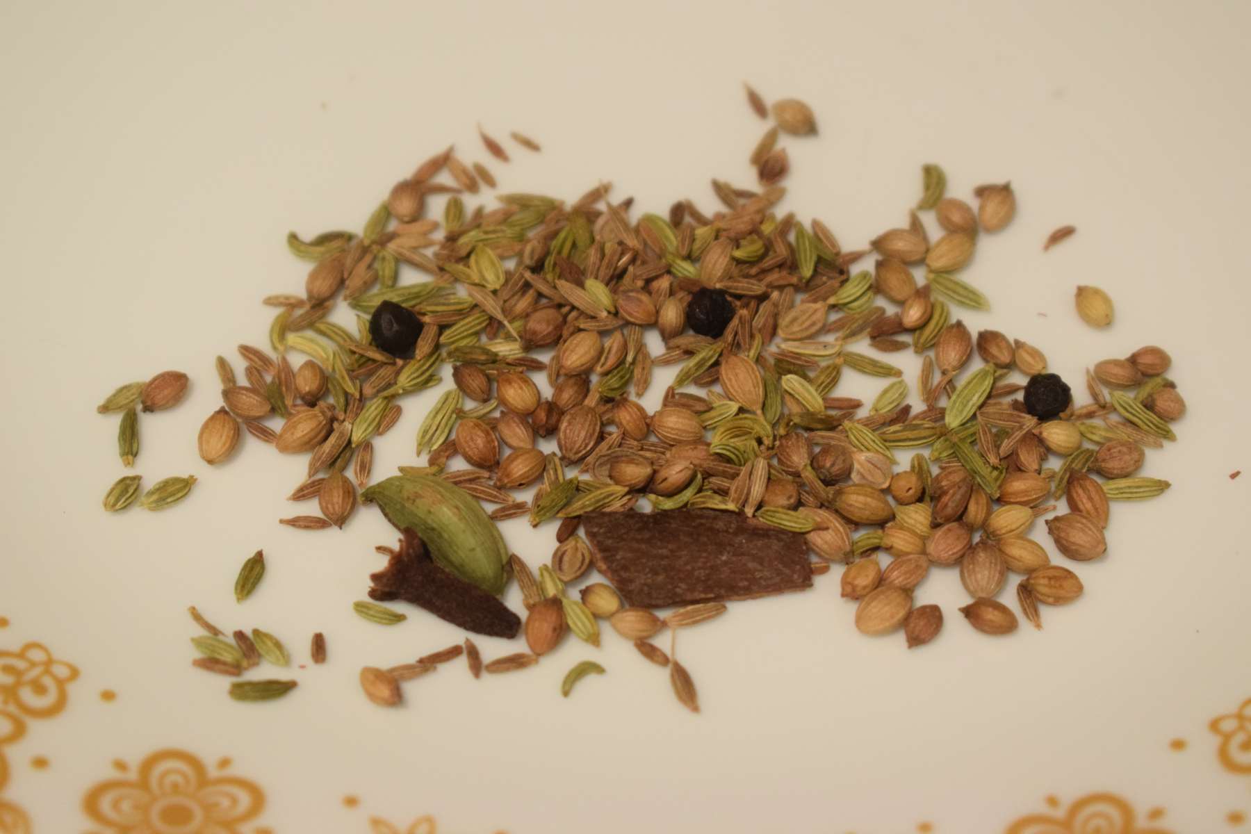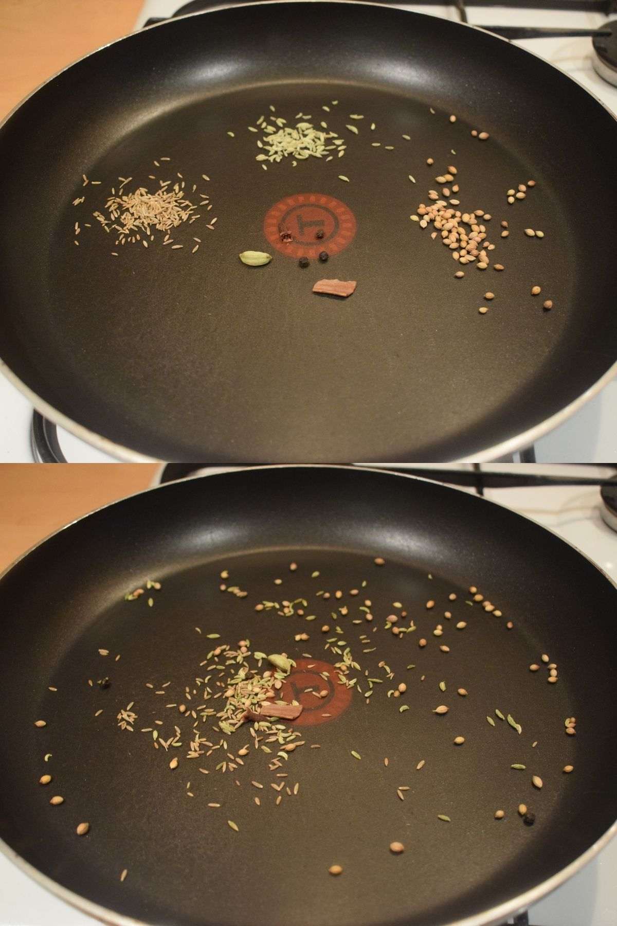 - Add ¼ teaspoon cumin seeds, ½ teaspoon coriander seeds, ¼ teaspoon fennel seeds, 3 pepper corns, ¼ inch cinnamon stick, 1 clove and 1 small cardamom into the pan and dry roast them over medium low flame for 1-2 minutes until a nice aroma comes up.