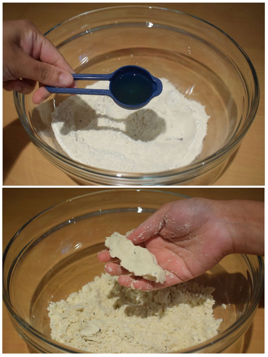 - Add 2 tablespoons oil into the mixture and mix it evenly until crumbs occur.
