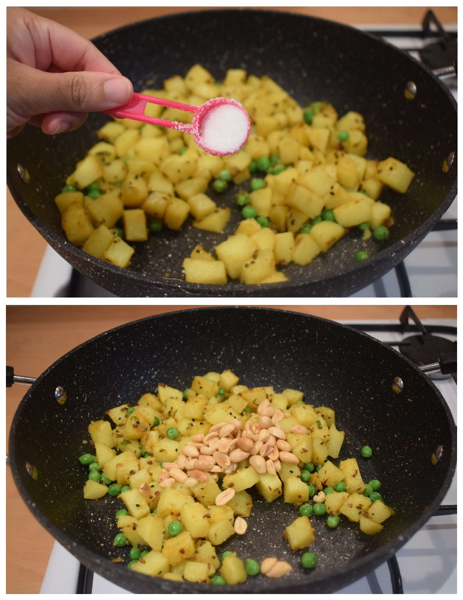 - Add sugar, fried peanuts (Step 12) into the pan and mix it properly.
