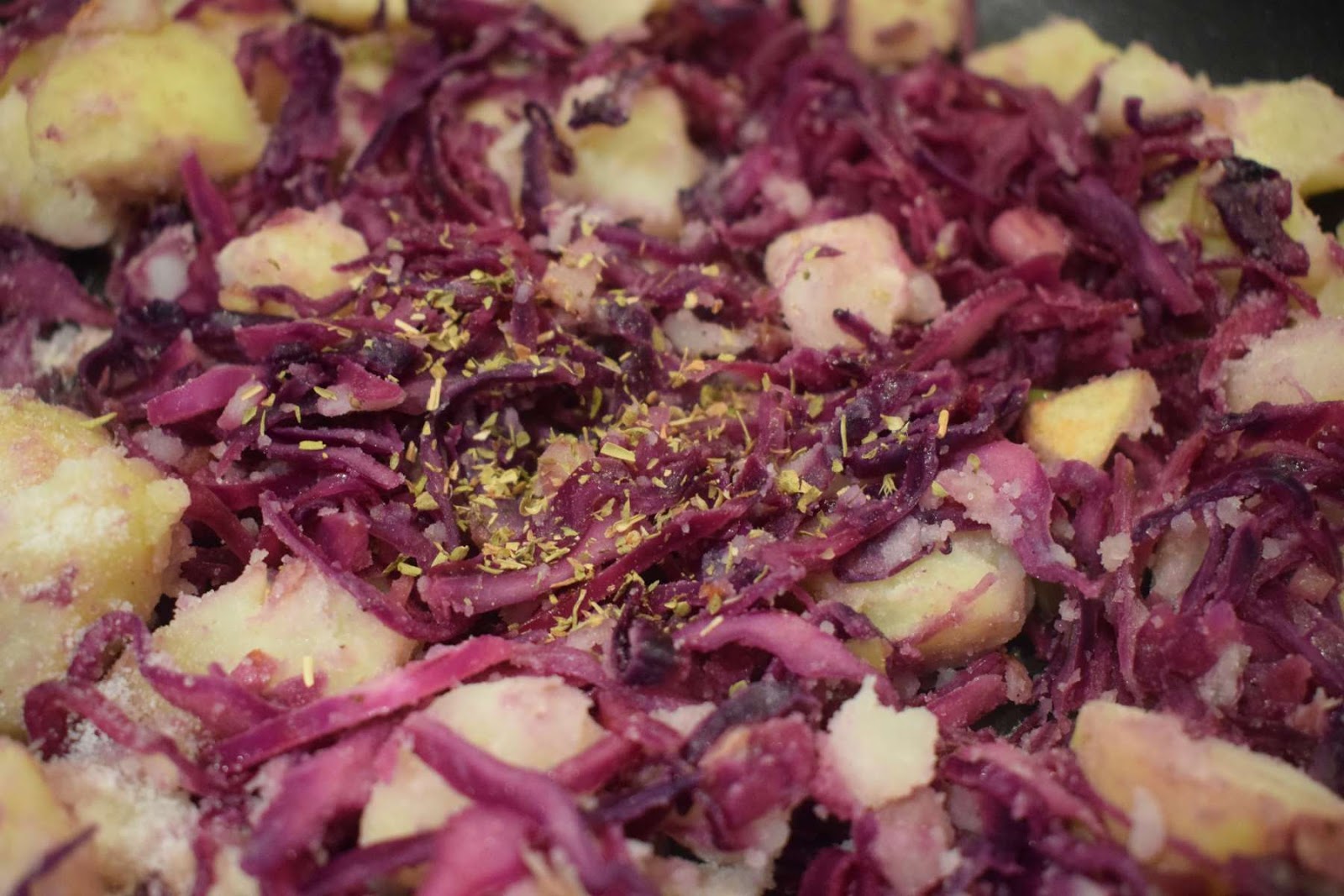 I have used Black Pepper powder, Oregano, dried Parsley and some Salt as seasoning for the dish. These gives a nice flavour to the dish. Red Cabbage itself has a unique flavour and many people love that. So, I have not added too much spice into it. But you are spicy food lover like me then you can sprinkle some extra seasoning and dressing to give a spicy kick to the dish.