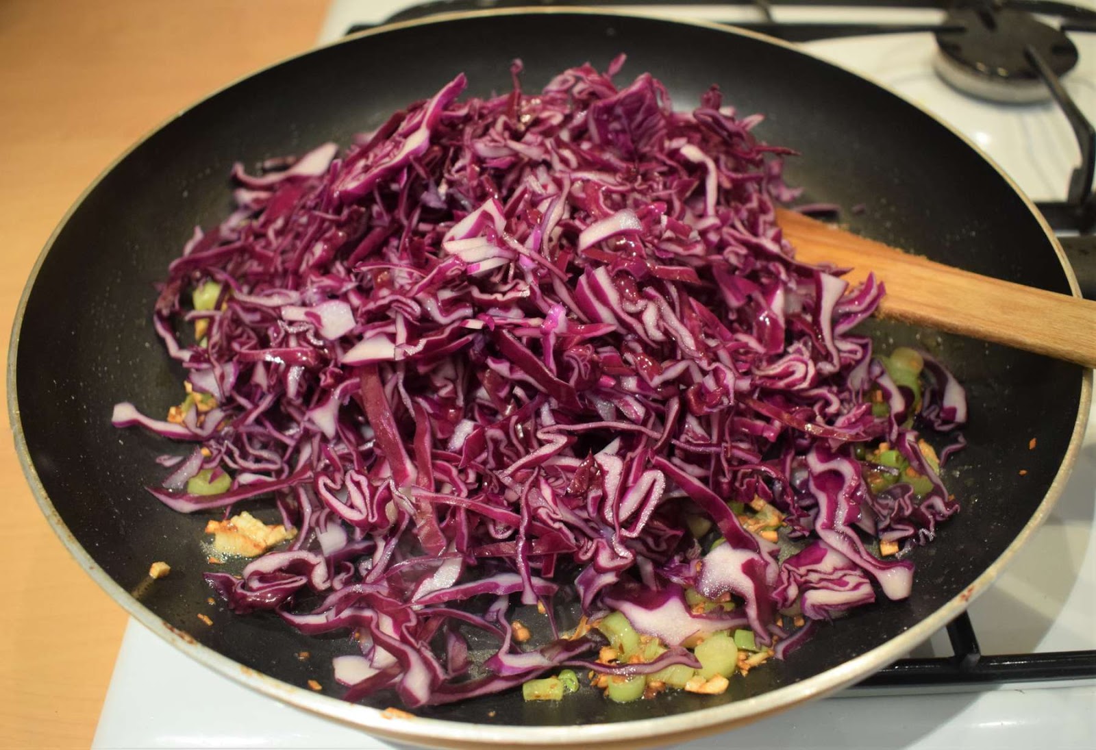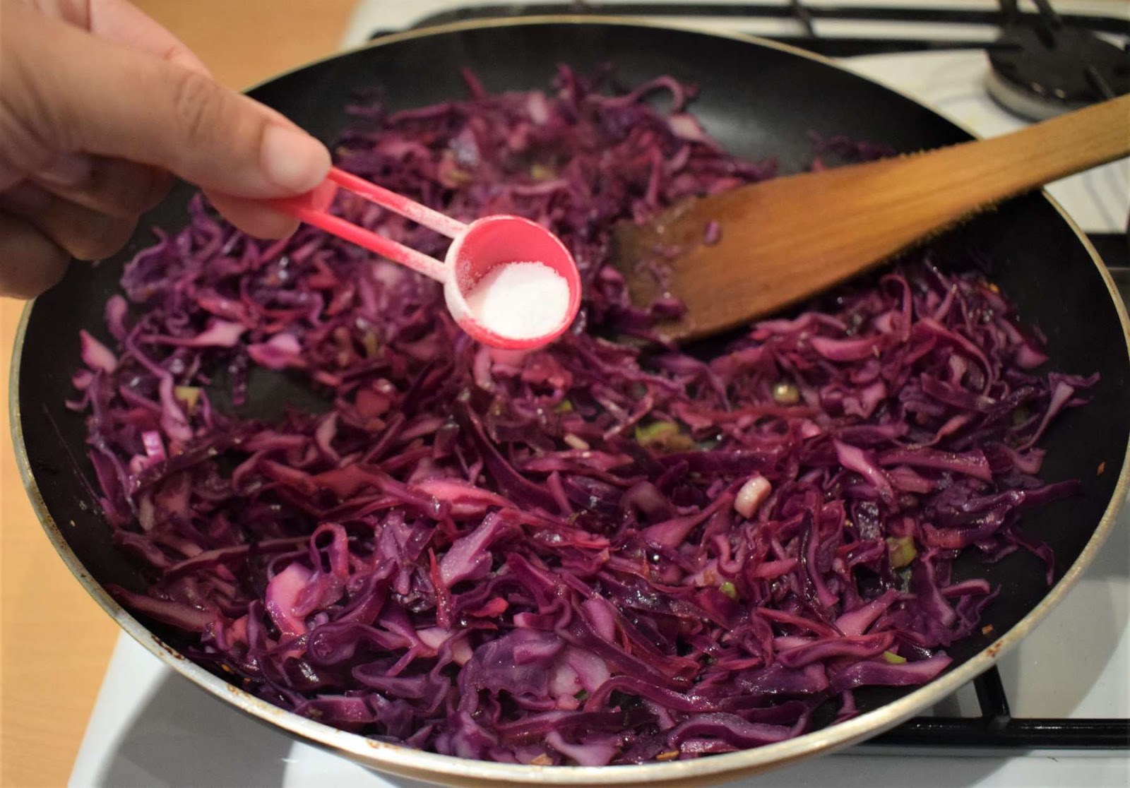 - Add the shredded Red Cabbage into the pan and sauté them in high flame for couple of minutes. Stir in between when required.