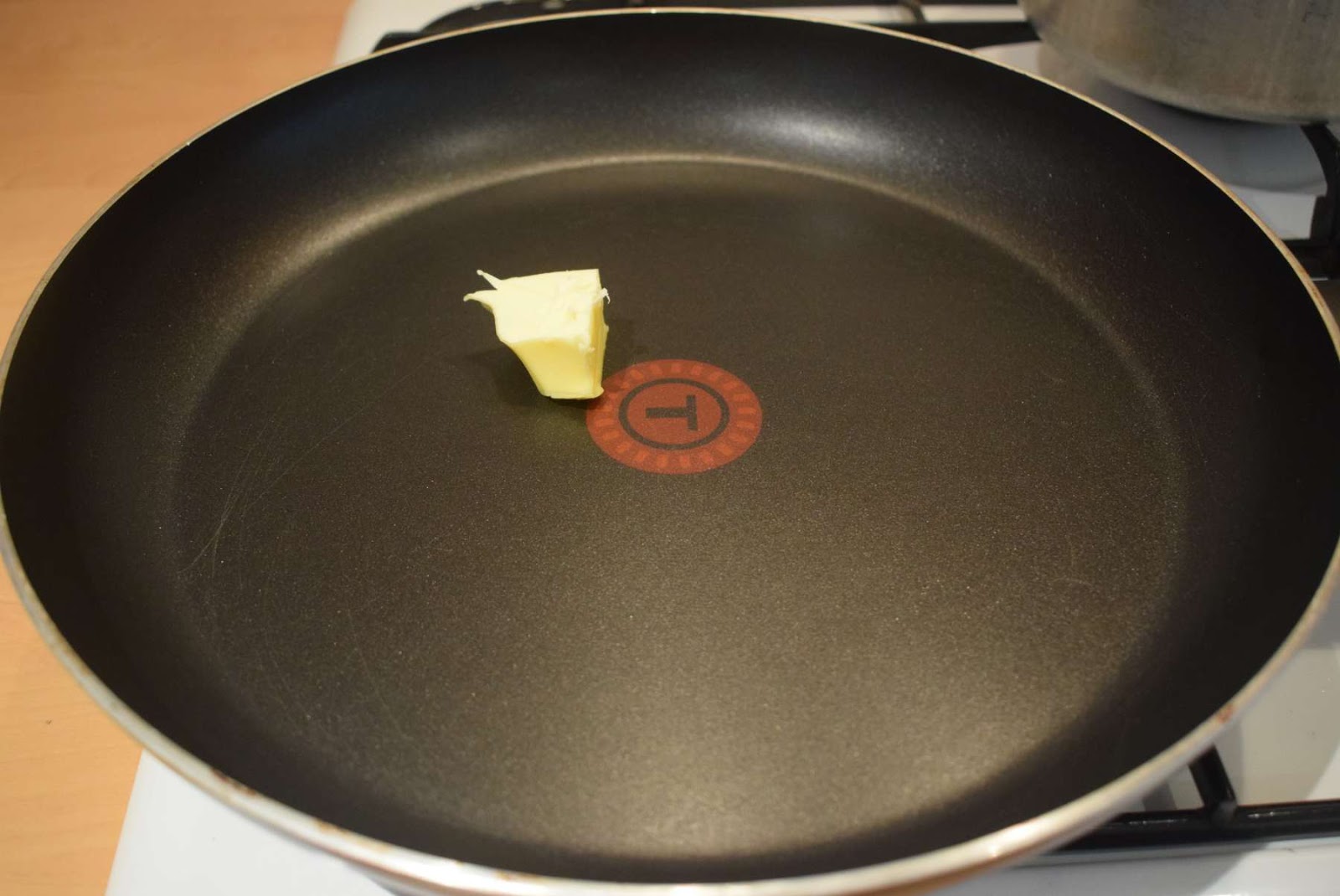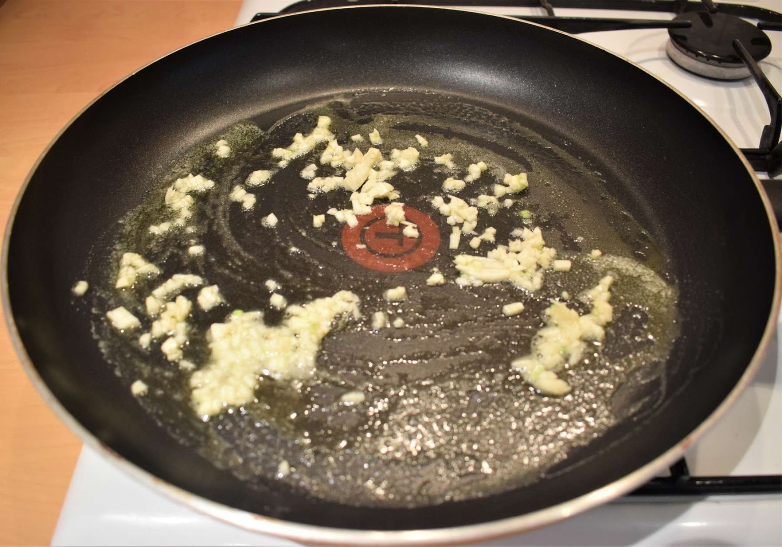 - Once the Butter melts and start bubbling, add chopped Garlic into it.