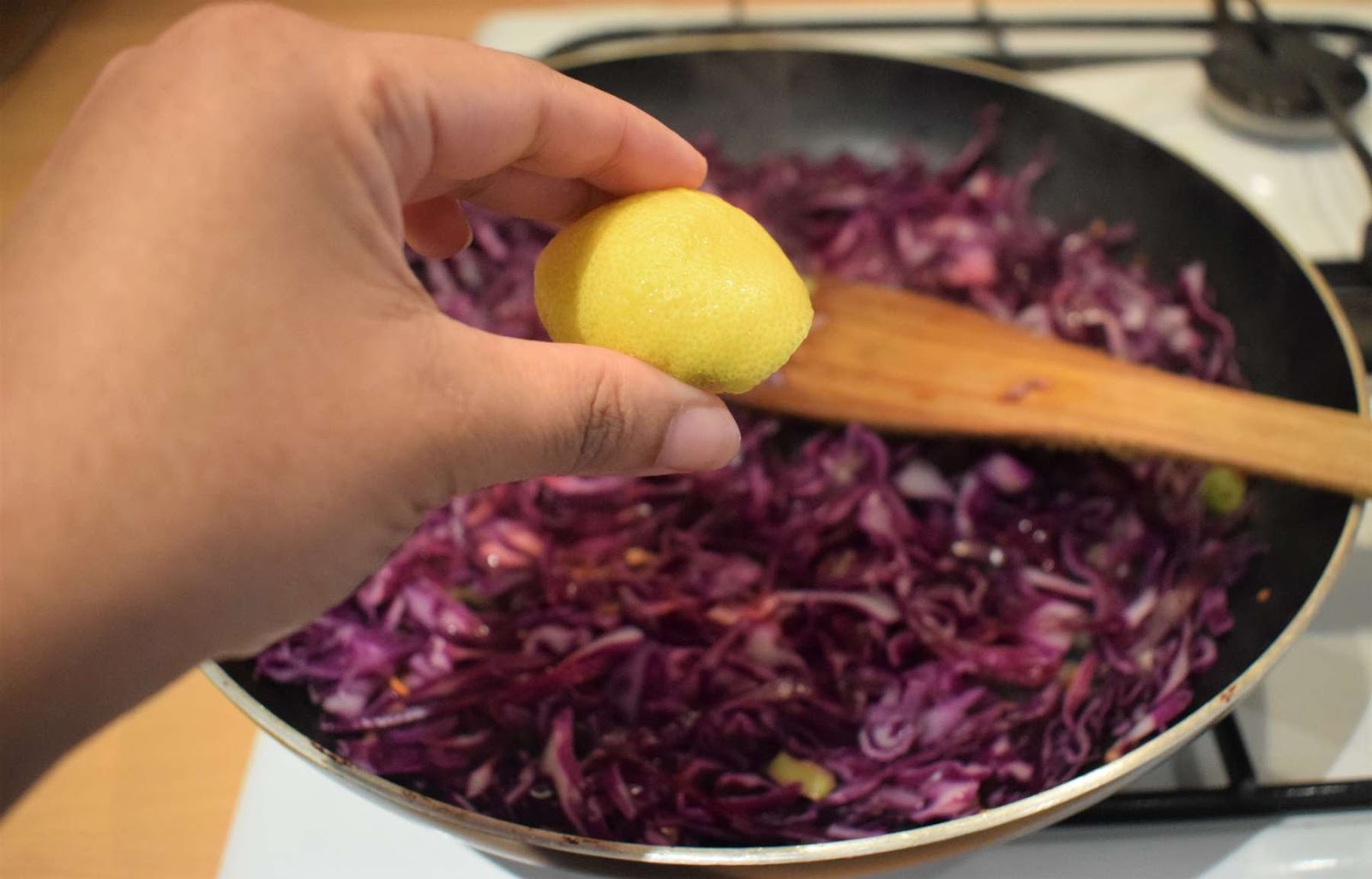 I have squeezed some Lemon juice into the pan to resist the Red Cabbage to turn blue. It gives a tangy touch to the dish and enhances the taste of the dish. Red Cabbages normally turn blue or dark after cooking and to avoid it some acidic fruit or Vinegar must be added.