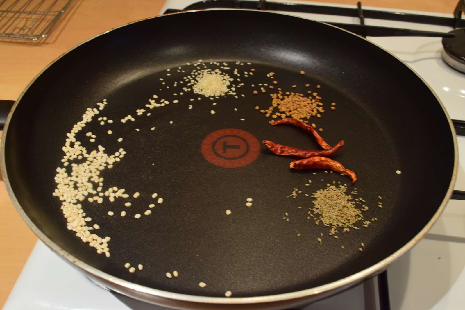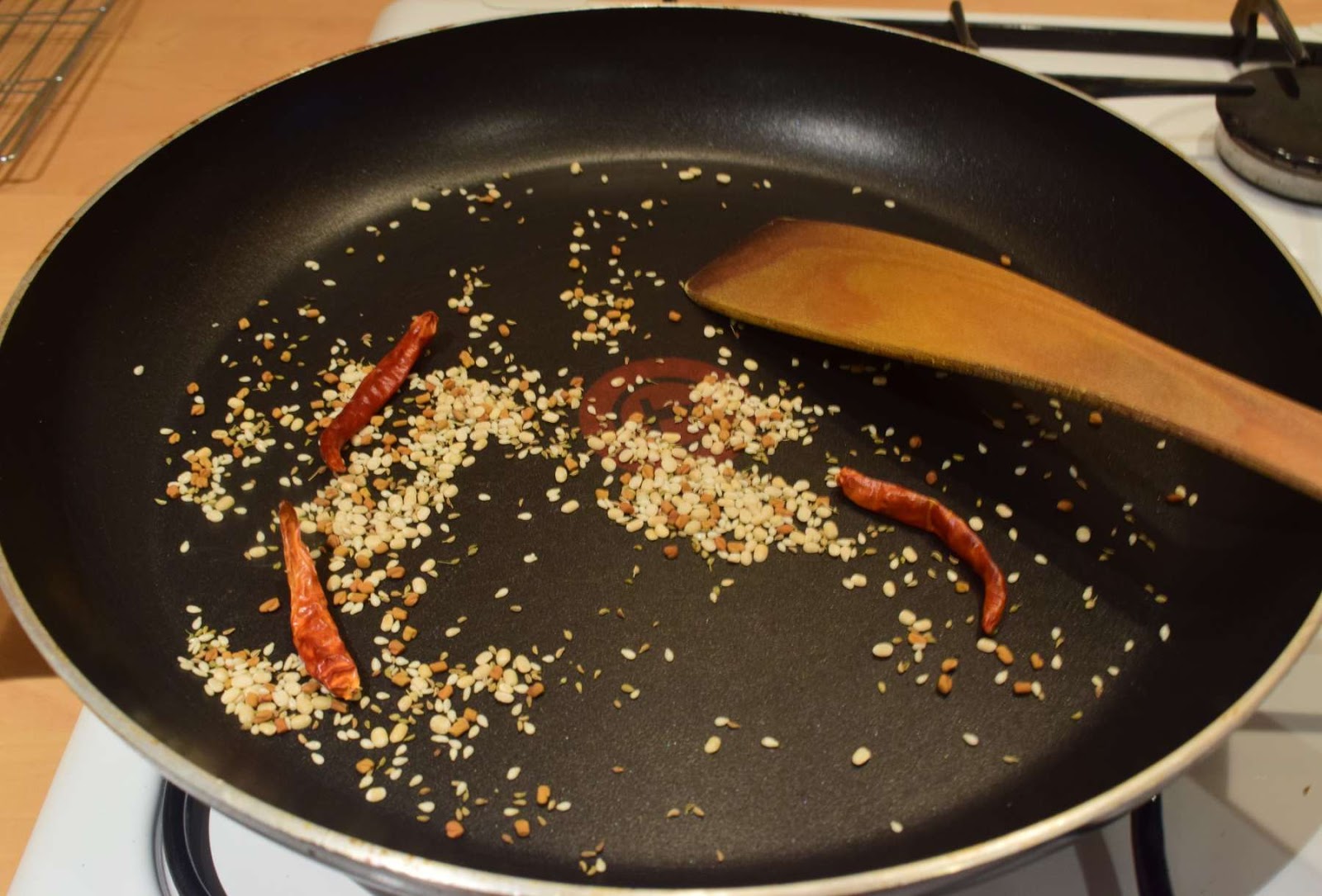 - Add Carom seeds, Fenugreek seeds, Sesame seeds, dry red Chilli into the pan.
